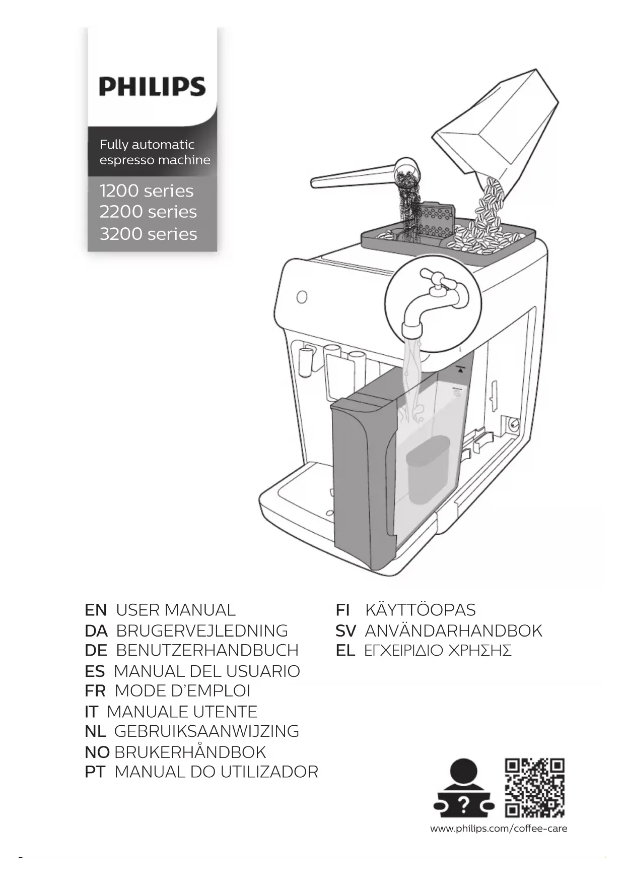 - Icônes de boissons: espresso, espresso lungo, café, americano, cappuccino, latte macchiato, eau chaude, vapeur (certains modèles uniquement) Introduction Félicitations pour votre achat d’une machine à café Philips entièrement automatique! Pour bénéficier pleinement de l’assistance Philips, veuillez enregistrer votre produit sur le site www.philips.com/welcome. Lisez attentivement le livret de sécurité distinct avant d’utiliser la machine pour la première fois, et conservez-le pour un usage ultérieur. Pour vous aider à vous familiariser avec votre machine et en profiter au maximum, Philipsoffre une assistance à plusieurs égards. La boîte contient les éléments suivants: 1 Le présent mode d’emploi avec les instructions d’utilisation illustrées et de plus amples informations sur le nettoyage et l’entretien. Il existe plusieurs versions de cette machine à espresso, présentant différentes fonctionnalités. Chaque version a sa propre référence. Vous trouverez le numéro de référence sur l'étiquette de données située à l'intérieur de la porte d'accès (voir fig. A11). 2 Le livret de sécurité séparé, avec les instructions relatives à l’utilisation sûre de la machine à café. 3 Pour une assistance en ligne (foire aux questions, vidéos, etc.), veuillez scanner le code QR figurant sur la couverture du présent mode d’emploi ou visiter la page www.philips.com/coffee-care Cette machine a été testée avec du café. Bien qu'elle ait été soigneusement nettoyée, il se peut que quelques résidus de café subsistent. Nous garantissons néanmoins que la machine est entièrement neuve. La machine à café règle automatiquement la quantité de café moulu utilisée pour obtenir un café au goût optimal. Il convient de préparer initialement 5cafés pour permettre à la machine de compléter son autoréglage. Veillez à rincer le LatteGo (réservoir de lait) ou le mousseur à lait classique avant la première utilisation.