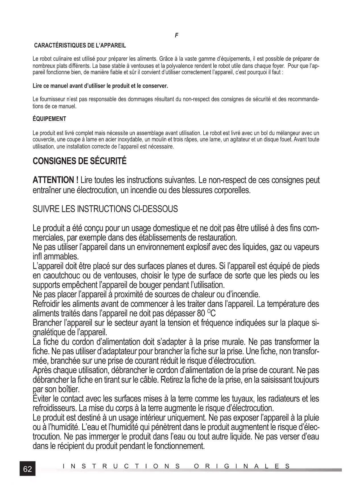 Brancher l’appareil sur le secteur ayant la tension et fréquence indiquées sur la plaque si- gnalétique de l’appareil. La fi che du cordon d’alimentation doit s’adapter à la prise murale. Ne pas transformer la fi che. Ne pas utiliser d’adaptateur pour brancher la fi che sur la prise. Une fi che, non transfor- mée, branchée sur une prise de courant réduit le risque d’électrocution. Après chaque utilisation, débrancher le cordon d’alimentation de la prise de courant. Ne pas débrancher la fi che en tirant sur le câble. Retirez la fi che de la prise, en la saisissant toujours par son boîtier. Éviter le contact avec les surfaces mises à la terre comme les tuyaux, les radiateurs et les refroidisseurs. La mise du corps à la terre augmente le risque d’électrocution. Le produit est destiné à un usage intérieur uniquement. Ne pas exposer l’appareil à la pluie ou à l’humidité. L’eau et l’humidité qui pénètrent dans le produit augmentent le risque d’élec- trocution. Ne pas immerger le produit dans l’eau ou tout autre liquide. Ne pas verser d’eau dans le récipient du produit pendant le fonctionnement.63 INSTRUCTIONS ORIGINALES