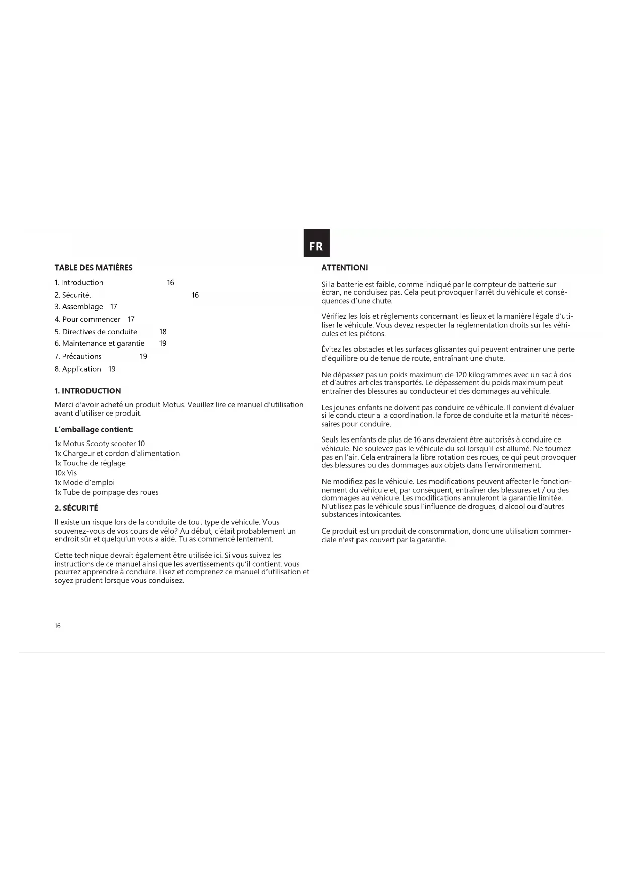 Merci d’avoir acheté un produit Motus. Veuillez lire ce manuel d’utilisation avant d’utiliser ce produit. L’emballage contient: 1x Motus Scooty scooter 10 1x Chargeur et cordon d’alimentation 1x Touche de réglage 10x Vis 1x Mode d’emploi 1x Tube de pompage des roues