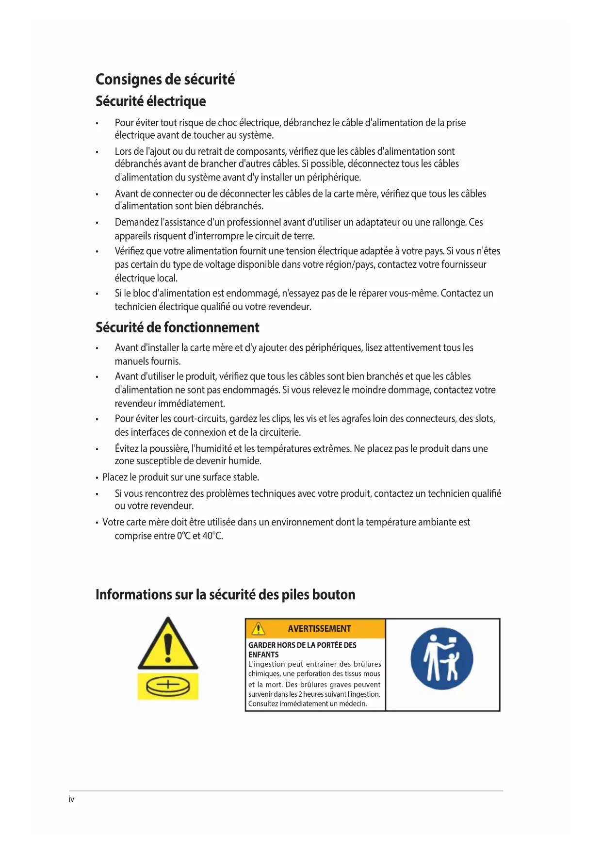 - Votre carte mère doit être utilisée dans un environnement dont la température ambiante est comprise entre 0°C et 40°C. Informations sur la sécurité des piles bouton AVERTISSEMENT GARDER HORS DE LA PORTÉE DES ENFANTS L'ingestion peut entraîner des brûlures chimiques, une perforation des tissus mous et la mort. Des brûlures graves peuvent survenir dans les 2 heures suivant l'ingestion. Consultez immédiatement un médecin.v À propos de ce manuel Ce manuel de l'utilisateur contient les informations dont vous aurez besoin pour installer et congurer la carte mère. Organisation du manuel Ce manuel contient les parties suivantes :