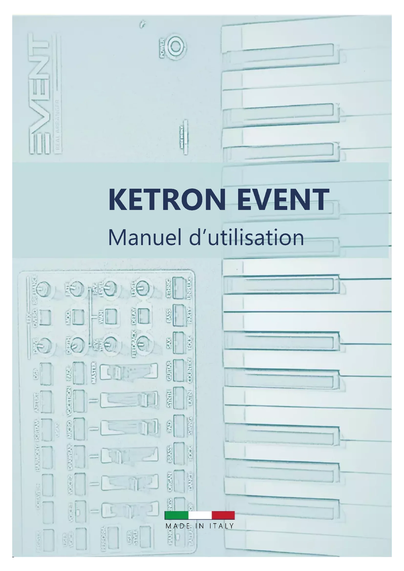 AVEC L’EVENT01 Commencer | 3 01 Commencer Introduction Merci et félicitations pour l’achat de l’EVENT. Vous disposez maintenant d’un clavier musical qui utilise les dernières technologies numériques pour vous donner accès à une qualité sonore et offrir des performances réalistes du plus haut niveau. Ce manuel d’utilisation explique en détail chaque caractéristique de l’instrument. Nous vous conseillons de le lire attentivement, au moins dans les parties qui vous intéressent, pour obtenir les meilleures performances d’EVENT lors de sessions live, en studio d’enregistrement ou dans tout autre contexte où vous souhaitez utiliser cet instrument de musique. Les REAL STYLES que vous trouvez dans EVENT sont le résultat d’une innovation technologique extraordinaire que Ketron a spécialement conçue et mise en œuvre pour permettre aux musiciens d’exprimer leurs performances musicales avec le plus haut niveau de réalisme. Tout en préservant la possibilité d’interagir avec le MIDI, avec EVENT il est possible d’être accompagné d’un arrangement multipiste sous la domination totale de l’audio. Dans le passé, Ketron était connu pour les LIVE DRUMS et LIVE GUITARS, maintenant presque tout l’arrangement peut être exprimé en format audio, avec l’ajout des toutes nouvelles pistes REAL BASS et REAL CHORD qui complètent le groupe et font d’EVENT un arrangeur unique et exclusif. Vous pouvez également créer vos propres REAL STYLES au format audio complet, grâce aux extensions introduites dans la nouvelle fonctionnalité Live Modeling. Les voix REAL SOLOS aident à enrichir vos parties solo: elles sonnent exactement comme elles ont été interprétées et la diminution du son s’estompe progressivement et naturellement. Essayez-les pour y croire. Avec EVENT le Morphing est également disponible, une fonctionnalité simple et immédiate pour rendre votre musique originale et donner de la variété à vos performances live: cette fonctionnalité puissante favorise la transition dynamique d’un son à l’autre, sans enlever les mains du clavier. Imaginez changer4 | 01 Commencer constamment les registres d’orgue, activer les effets de rotor, démarrer le vibrato de la section DRAWBAR ou migrer d’un son Pad vers un son orchestral plus grand rempli de voix instrumentales. Il n’y a pas de limites à la dynamique de votre créativité. L’introduction de la fonction Stem dans EVENT augmente considérablement la valeur du kit fonctionnel de l’instrument. Le Stem est une nouveauté récemment introduite par Ketron sur ses modèles et donne la possibilité de lire jusqu’à cinq pistes audios simultanément en parfaite synchronisation. Chaque piste audio dispose de commandes individuelles de sourdine et de volume et vous pouvez modifier sa hauteur et son tempo sans modifier la hauteur du rythme. Il est également possible d’exclure une ou plusieurs pistes de la lecture, par exemple la piste de piano ou de basse, si vous souhaitez jouer en live. Ces innovations importantes s’ajoutent à un répertoire de styles et de sons qui confirment et élargissent le niveau de réalisme musical offert par les instruments produits par Ketron, une marque qui, depuis sa fondation, a conçu et fabriqué des instruments célèbres pour la dotation remarquable de caractéristiques en faveur des musiciens les plus exigeants. Le panneau avant Panoramique du panneau avant Le panneau avant d’EVENT est composé de plusieurs blocs :