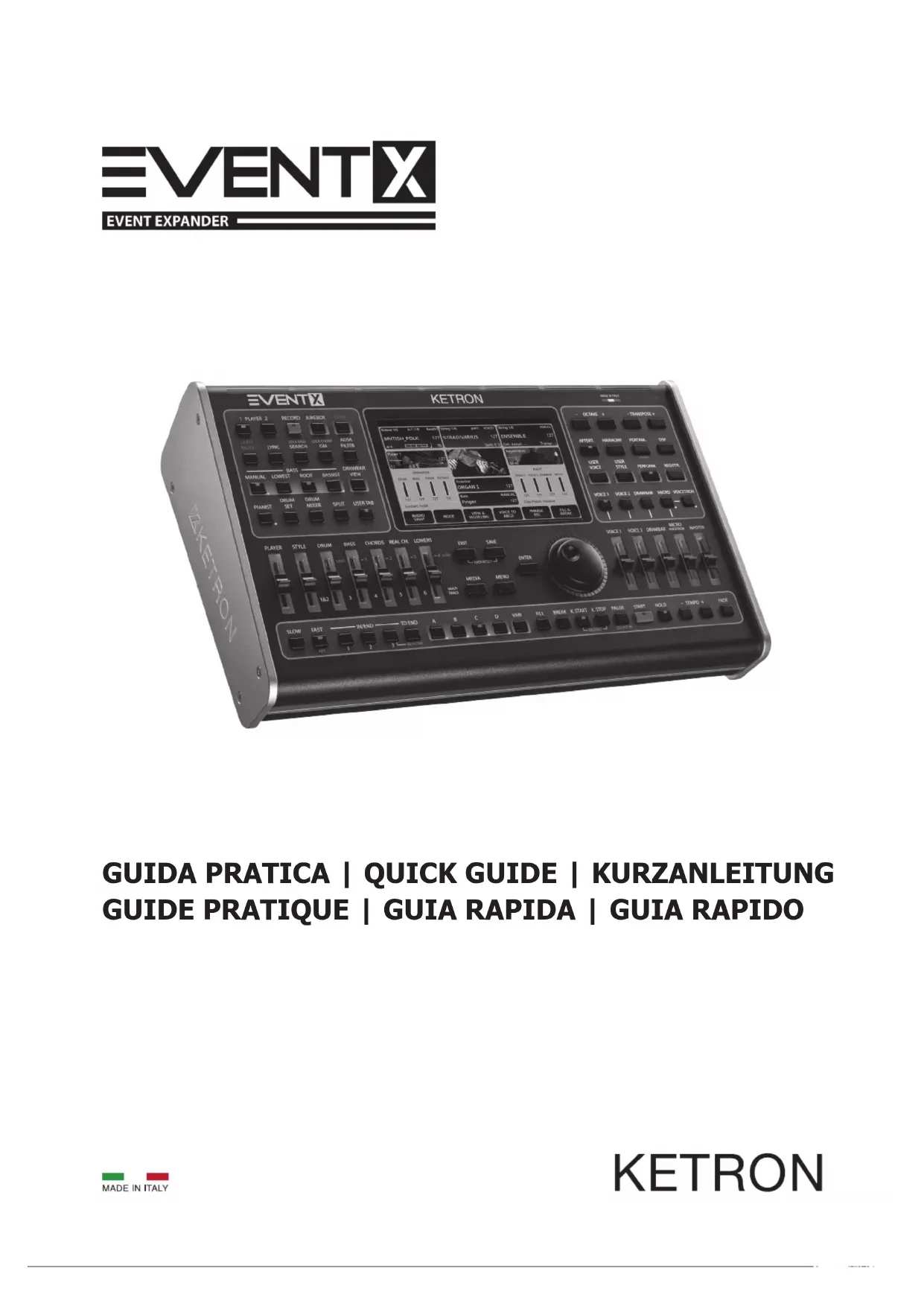 FRANÇAIS Bienvenus! Merci d’avoir acheté le Ketron EVENT X! Dansce“Manueld’instructions”lesopérationsprincipalesserontdécritespour uneutilisationimmédiatedel’instrument.Nousvousprionsdelireattentivement ce manuel d’instructions dans la clé USB disponible avec l’instrument, pour obtenirlerendementmaxetdesperformancesélevéespendantsonutilisation endirectetenstudio. Lemêmemanuelestdisponibleégalementsurlesitewebwww.ketron.itoùvous pourreztrouveraussid’autresinformationsetutilitairesrelatifsauEVENTX. EVENTXrévolutionnecomplètementlamanièred’utilisationgrâceaunouvelet grandafcheurtactile.Eneffetlaplupartdesfonctionsestaccessibleparun“coup dedoigt”directementsurl’écran,encorrespondancedestouchesintéressées. IMPORTANT: nousvousinvitonsàenregistrerleproduitsurnotresite www.ketron.itpourlavaliditédelagarantie./16