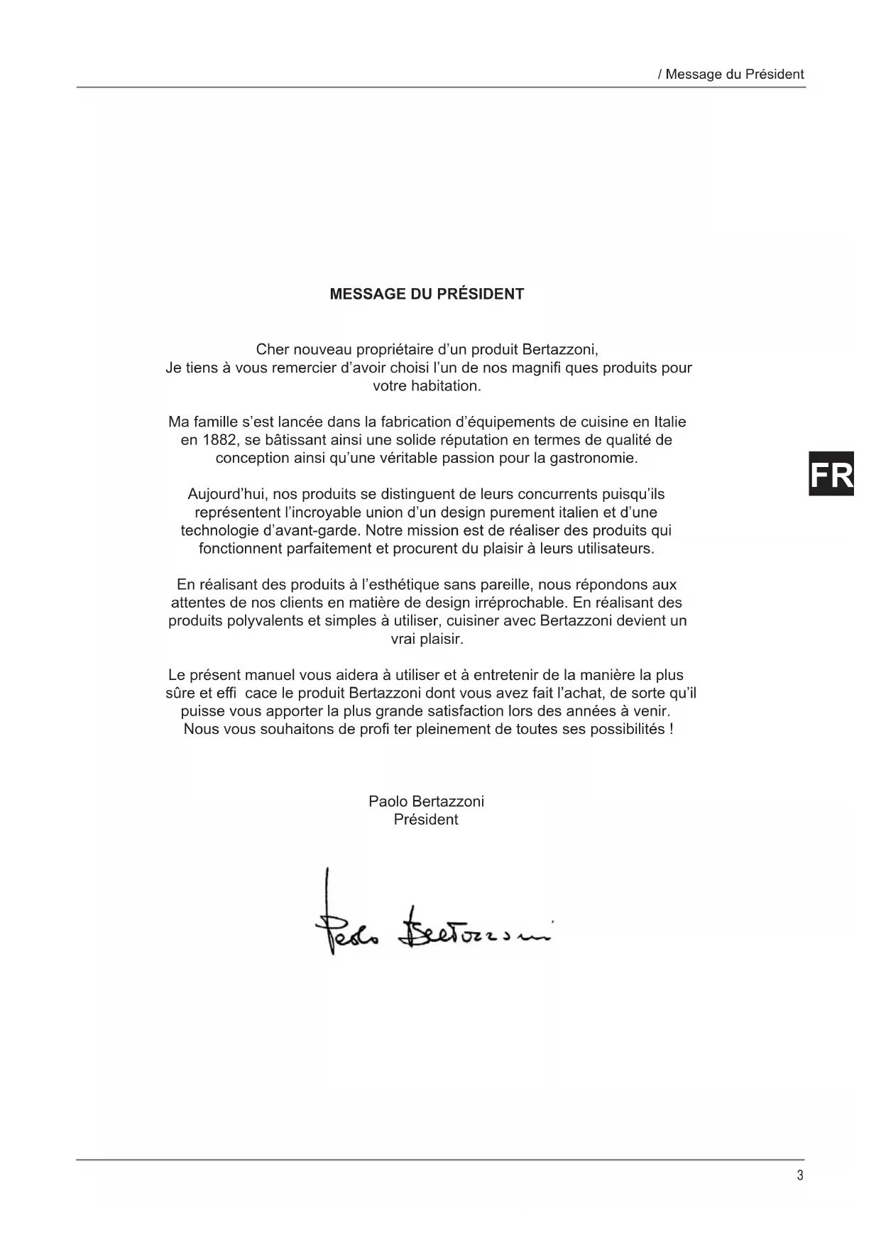 Cher nouveau propriétaire d’un produit Bertazzoni, Je tiens à vous remercier d’avoir choisi l’un de nos magnifi ques produits pour votre habitation. Ma famille s’est lancée dans la fabrication d’équipements de cuisine en Italie en 1882, se bâtissant ainsi une solide réputation en termes de qualité de conception ainsi qu’une véritable passion pour la gastronomie. Aujourd’hui, nos produits se distinguent de leurs concurrents puisqu’ils représentent l’incroyable union d’un design purement italien et d’une technologie d’avant-garde. Notre mission est de réaliser des produits qui fonctionnent parfaitement et procurent du plaisir à leurs utilisateurs. En réalisant des produits à l’esthétique sans pareille, nous répondons aux attentes de nos clients en matière de design irréprochable. En réalisant des produits polyvalents et simples à utiliser, cuisiner avec Bertazzoni devient un vrai plaisir. Le présent manuel vous aidera à utiliser et à entretenir de la manière la plus sûre et effi cace le produit Bertazzoni dont vous avez fait l’achat, de sorte qu’il puisse vous apporter la plus grande satisfaction lors des années à venir. Nous vous souhaitons de profi ter pleinement de toutes ses possibilités ! Paolo Bertazzoni Président4