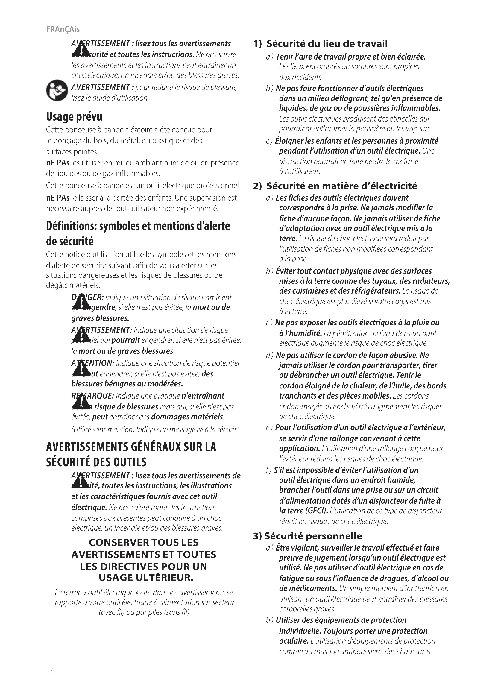 REMARQUE: indique une pratique n'entraînant aucun risque de blessures mais qui, si elle n'est pas évitée, peut entraîner des dommagesmatériels. (Utilisé sans mention) Indique un message lié à lasécurité. Usage prévu Cette ponceuse à bande aléatoire a été conçue pour le ponçage du bois, du métal, du plastique et des surfacespeintes. nE PAs les utiliser en milieu ambiant humide ou en présence de liquides ou de gazinflammables. Cette ponceuse à bande est un outil électriqueprofessionnel. nE PAs le laisser à la portée des enfants. Une supervision est nécessaire auprès de tout utilisateur nonexpérimenté.FRAnçAis