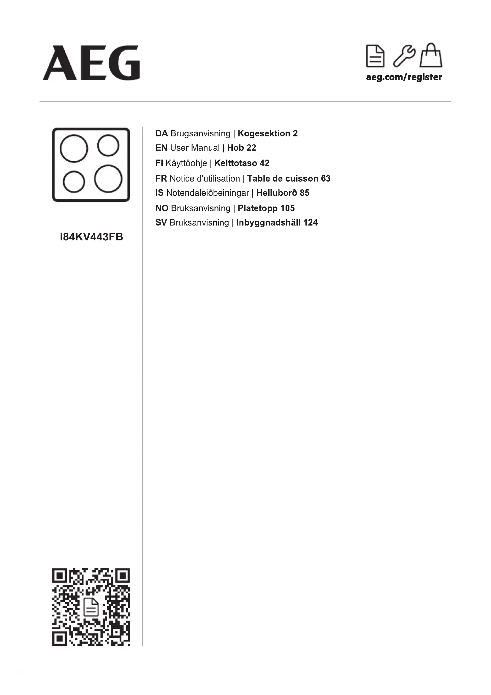 Recyclez les matériaux portant le symbole . Déposez les emballages dans les conteneurs prévus à cet effet. Contribuez à la protection de l'environnement et à votre sécurité, recyclez vos produits électriques et électroniques. Ne jetez pas les appareils portant le symbole avec les ordures ménagères. Emmenez un tel produit dans votre centre local de recyclage ou contactez vos services municipaux. Concerne la France uniquement : 84 FRANÇAISVelkomin(n) til AEG! Þakka þér fyrir að velja heimilistækið okkar. Fá leiðbeiningar um notkun, bæklinga, bilanaleit, þjónustu- og viðgerðarupplýsingar.www.aeg.com/supportMeð fyrirvara á breytingum. EFNISYFIRLIT