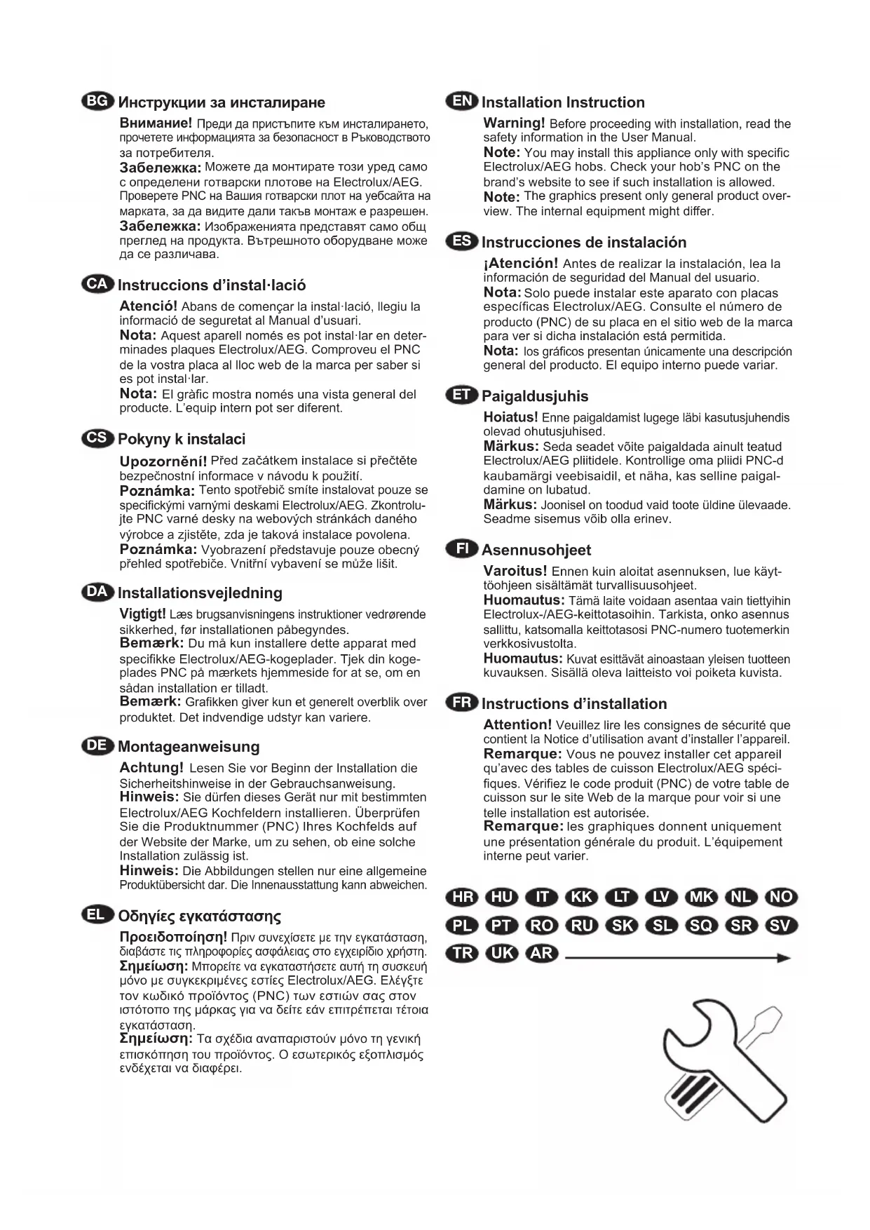 Instructions d’installation Attention! Veuillez lire les consignes de sécurité que contient la Notice d’utilisation avant d’installer l’appareil. Remarque: Vous ne pouvez installer cet appareil qu’avec des tables de cuisson Electrolux/AEG spéci- ques. Vériez le code produit (PNC) de votre table de cuisson sur le site Web de la marque pour voir si une telle installation est autorisée. Remarque: les graphiques donnent uniquement une présentation générale du produit. L’équipement interne peut varier.