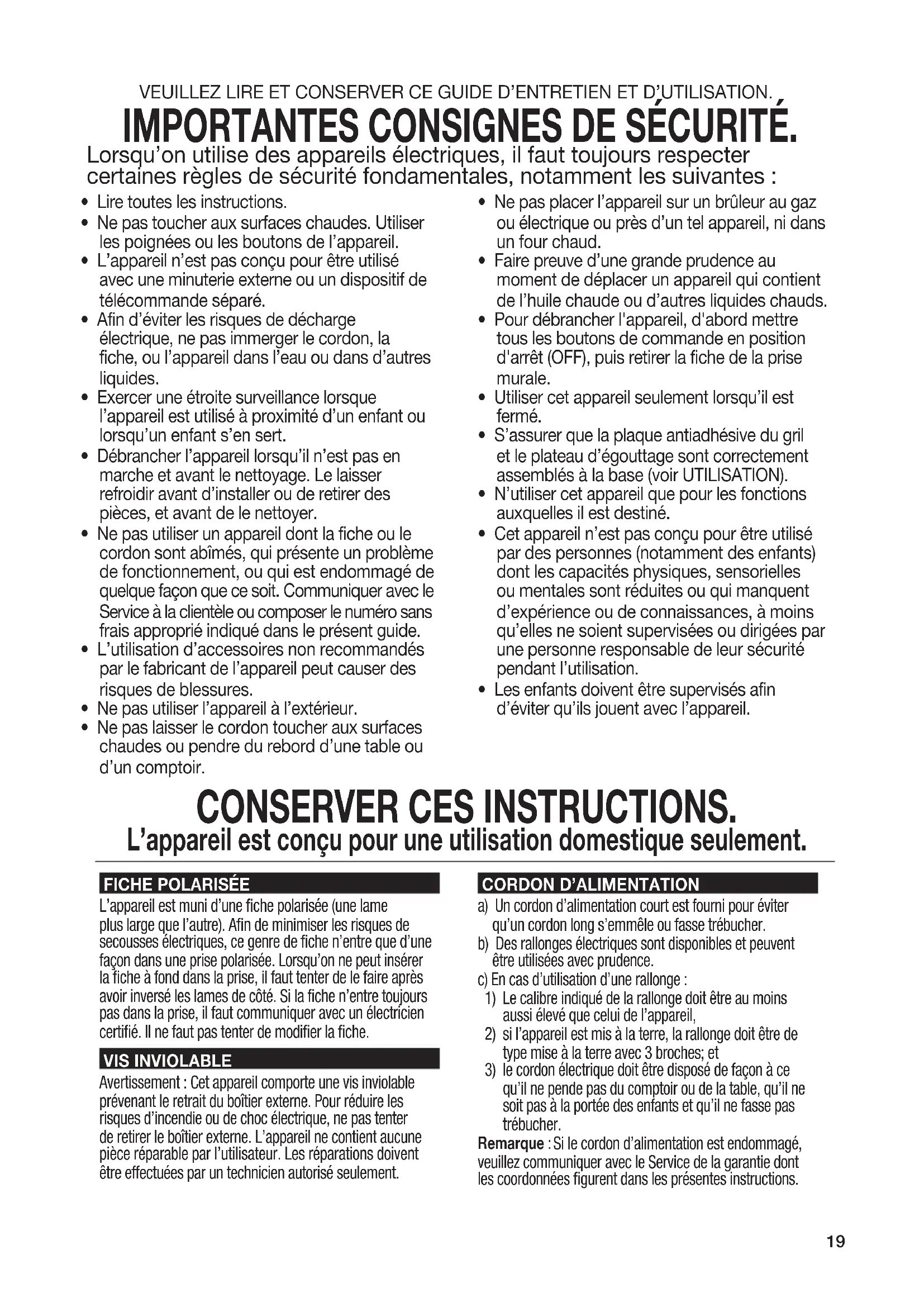 qu’il ne pende pas du comptoir ou de la table, qu’il ne soit pas à la portée des enfants et qu’il ne fasse pas trébucher. Remarque : Si le cordon d’alimentation est endommagé, veuillez communiquer avec le Service de la garantie dont les coordonnées gurent dans les présentes instructions. VEUILLEZ LIRE ET CONSERVER CE GUIDE D’ENTRETIEN ET D’UTILISATION. IMPORTANTES CONSIGNES DE SÉCURITÉ. Lorsqu’on utilise des appareils électriques, il faut toujours respecter certaines règles de sécurité fondamentales, notamment les suivantes : CONSERVER CES INSTRUCTIONS. L’appareil est conçu pour une utilisation domestique seulement.20
