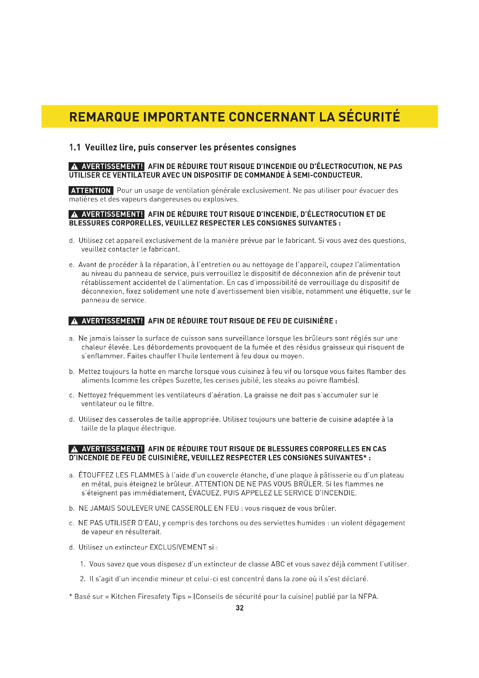 AVERTISSEMENT! AFIN DE RÉDUIRE TOUT RISQUE D’INCENDIE OU D’ÉLECTROCUTION, NE PAS UTILISER CE VENTILATEUR AVEC UN DISPOSITIF DE COMMANDE À SEMI-CONDUCTEUR. ATTENTION Pour un usage de ventilation générale exclusivement. Ne pas utiliser pour évacuer des matières et des vapeurs dangereuses ou explosives. AVERTISSEMENT! AFIN DE RÉDUIRE TOUT RISQUE D’INCENDIE, D’ÉLECTROCUTION ET DE BLESSURES CORPORELLES, VEUILLEZ RESPECTER LES CONSIGNES SUIVANTES : d. Utilisez cet appareil exclusivement de la manière prévue par le fabricant. Si vous avez des questions, veuillez contacter le fabricant. e. Avant de procéder à la réparation, à l’entretien ou au nettoyage de l’appareil, coupez l’alimentation au niveau du panneau de service, puis verrouillez le dispositif de déconnexion afin de prévenir tout rétablissement accidentel de l’alimentation. En cas d’impossibilité de verrouillage du dispositif de déconnexion, fixez solidement une note d’avertissement bien visible, notamment une étiquette, sur le panneau de service. AVERTISSEMENT! AFIN DE RÉDUIRE TOUT RISQUE DE FEU DE CUISINIÈRE : a. Ne jamais laisser la surface de cuisson sans surveillance lorsque les brûleurs sont réglés sur une chaleur élevée. Les débordements provoquent de la fumée et des résidus graisseux qui risquent de s’enflammer. Faites chauffer l’huile lentement à feu doux ou moyen. b. Mettez toujours la hotte en marche lorsque vous cuisinez à feu vif ou lorsque vous faites flamber des aliments (comme les crêpes Suzette, les cerises jubilé, les steaks au poivre flambés). c. Nettoyez fréquemment les ventilateurs d’aération. La graisse ne doit pas s’accumuler sur le ventilateur ou le filtre. d. Utilisez des casseroles de taille appropriée. Utilisez toujours une batterie de cuisine adaptée à la taille de la plaque électrique. AVERTISSEMENT! AFIN DE RÉDUIRE TOUT RISQUE DE BLESSURES CORPORELLES EN CAS D’INCENDIE DE FEU DE CUISINIÈRE, VEUILLEZ RESPECTER LES CONSIGNES SUIVANTES* : a. ÉTOUFFEZ LES FLAMMES à l’aide d’un couvercle étanche, d’une plaque à pâtisserie ou d’un plateau en métal, puis éteignez le brûleur. ATTENTION DE NE PAS VOUS BRÛLER. Si les flammes ne s’éteignent pas immédiatement, ÉVACUEZ, PUIS APPELEZ LE SERVICE D’INCENDIE. b. NE JAMAIS SOULEVER UNE CASSEROLE EN FEU : vous risquez de vous brûler. c. NE PAS UTILISER D’EAU, y compris des torchons ou des serviettes humides : un violent dégagement de vapeur en résulterait. d. Utilisez un extincteur EXCLUSIVEMENT si :