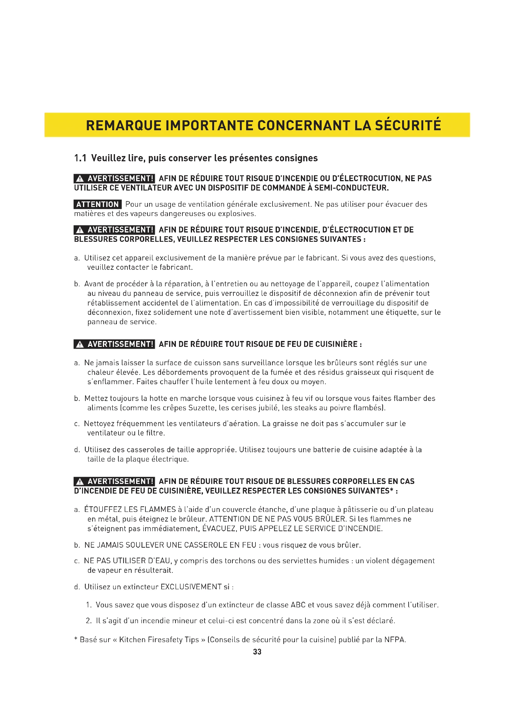 AVERTISSEMENT! AFIN DE RÉDUIRE TOUT RISQUE D’INCENDIE OU D’ÉLECTROCUTION, NE PAS UTILISER CE VENTILATEUR AVEC UN DISPOSITIF DE COMMANDE À SEMI-CONDUCTEUR. ATTENTION Pour un usage de ventilation générale exclusivement. Ne pas utiliser pour évacuer des matières et des vapeurs dangereuses ou explosives. AVERTISSEMENT! AFIN DE RÉDUIRE TOUT RISQUE D’INCENDIE, D’ÉLECTROCUTION ET DE BLESSURES CORPORELLES, VEUILLEZ RESPECTER LES CONSIGNES SUIVANTES : a. Utilisez cet appareil exclusivement de la manière prévue par le fabricant. Si vous avez des questions, veuillez contacter le fabricant. b. Avant de procéder à la réparation, à l’entretien ou au nettoyage de l’appareil, coupez l’alimentation au niveau du panneau de service, puis verrouillez le dispositif de déconnexion afin de prévenir tout rétablissement accidentel de l’alimentation. En cas d’impossibilité de verrouillage du dispositif de déconnexion, fixez solidement une note d’avertissement bien visible, notamment une étiquette, sur le panneau de service. AVERTISSEMENT! AFIN DE RÉDUIRE TOUT RISQUE DE FEU DE CUISINIÈRE : a. Ne jamais laisser la surface de cuisson sans surveillance lorsque les brûleurs sont réglés sur une chaleur élevée. Les débordements provoquent de la fumée et des résidus graisseux qui risquent de s’enflammer. Faites chauffer l’huile lentement à feu doux ou moyen. b. Mettez toujours la hotte en marche lorsque vous cuisinez à feu vif ou lorsque vous faites flamber des aliments (comme les crêpes Suzette, les cerises jubilé, les steaks au poivre flambés). c. Nettoyez fréquemment les ventilateurs d’aération. La graisse ne doit pas s’accumuler sur le ventilateur ou le filtre. d. Utilisez des casseroles de taille appropriée. Utilisez toujours une batterie de cuisine adaptée à la taille de la plaque électrique. AVERTISSEMENT! AFIN DE RÉDUIRE TOUT RISQUE DE BLESSURES CORPORELLES EN CAS D’INCENDIE DE FEU DE CUISINIÈRE, VEUILLEZ RESPECTER LES CONSIGNES SUIVANTES* : a. ÉTOUFFEZ LES FLAMMES à l’aide d’un couvercle étanche, d’une plaque à pâtisserie ou d’un plateau en métal, puis éteignez le brûleur. ATTENTION DE NE PAS VOUS BRÛLER. Si les flammes ne s’éteignent pas immédiatement, ÉVACUEZ, PUIS APPELEZ LE SERVICE D’INCENDIE. b. NE JAMAIS SOULEVER UNE CASSEROLE EN FEU : vous risquez de vous brûler. c. NE PAS UTILISER D’EAU, y compris des torchons ou des serviettes humides : un violent dégagement de vapeur en résulterait. d. Utilisez un extincteur EXCLUSIVEMENT si :