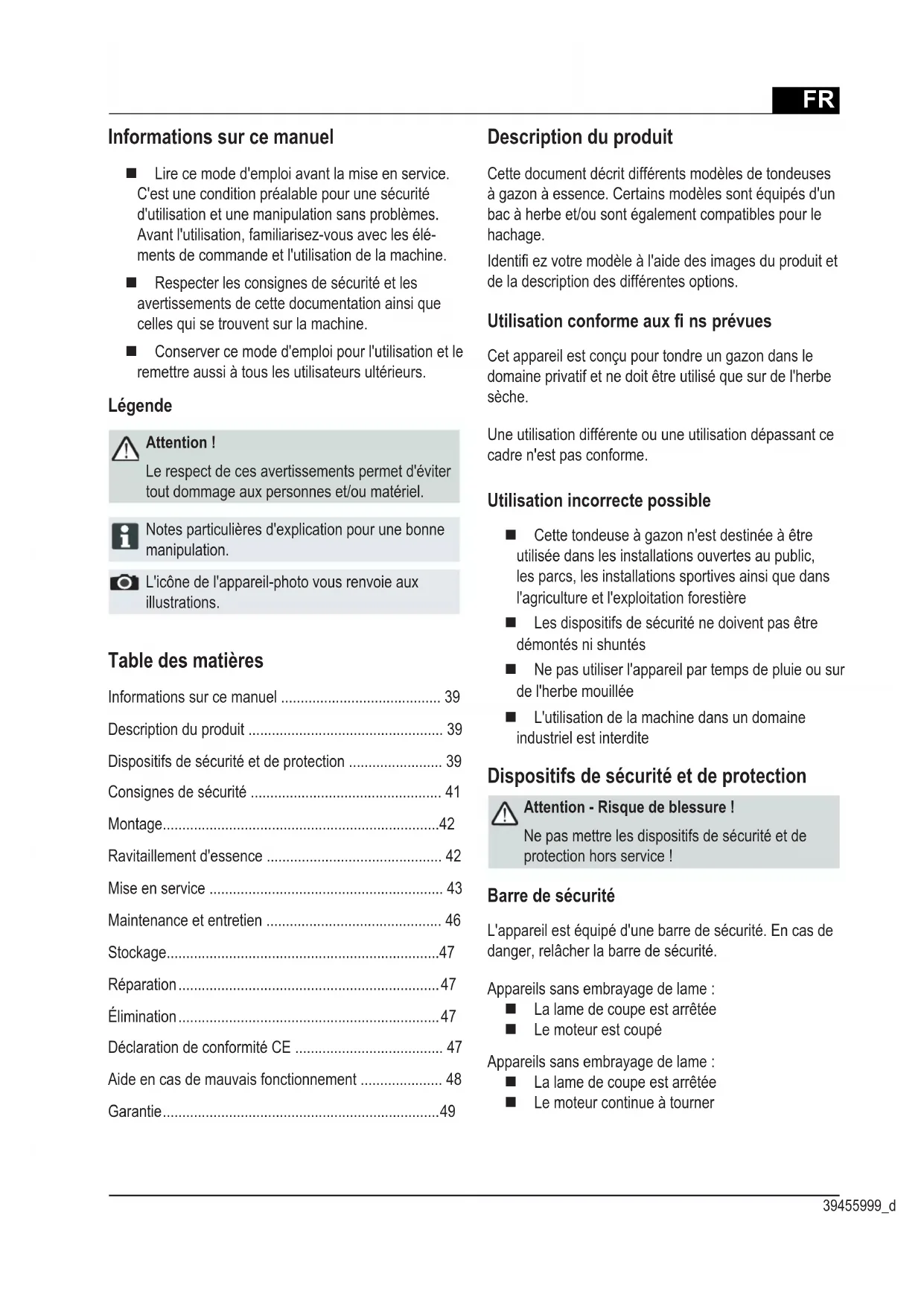 Volet défl ecteur Le défl ecteur sert de protection en cas d'éjection de pièces.FR 41455999_d Consignes de sécurité Attention ! Utiliser la machine seulement si elle est en parfait état du point de vue technique ! Attention - Risque de blessure ! Ne pas mettre les dispositifs de sécurité et de protection hors service ! Attention - Risque d'incendie ! Ne pas conserver les appareils remplis d'essence dans des bâtiments dans lesquels les vapeurs d'essence pourraient s'enfl ammer au contact d'une fl amme nue ou d'étincelles ! Maintenir la zone autour du moteur, de l'échappement, du coffre à batterie et du réservoir d'essence exempte de tout résidu de coupe, d'essence et d'huile. Les tiers doivent être tenus hors de la zone dan- gereuse Le propriétaire ou l'utilisateur de la machine est responsable en cas d'accident impliquant d'autres personnes et leur propriété Les enfants ou les autres personnes qui ne con- naissent pas ce notice d'instructions ne doivent pas utiliser l'appareil Observer les dispositions locales en matière d'âge minimum de l'utilisateur Ne pas utiliser l'appareil sous l'emprise de l'alcool, de la drogue ou après avoir pris des médicaments Porter des vêtements adaptés Pantalon long Chaussures solides et antidérapantes Protection auditive En cas de travail sur une pente Toujours veiller à la stabilité Toujours tondre en travers de la pente, jamais dans le sens ascendant ou descendant Ne pas tondre sur un pente inclinée à plus de 20° Faire particulièrement attention en tournant Ne travailler qu'à la lumière du jour suffi sante ou avec un éclairage artifi ciel Tenir le corps, les membres et les vêtements à l'écart du mécanisme de coupe Observer les dispositions en vigueur pour les ho- raires d'utilisation Ne pas laisser la machine en état de marche sans surveillance Ne tondre qu'avec une lame de coupe affûtée Ne jamais utiliser l'appareil avec des dispositifs de protection/des grilles de protection endommagés Ne jamais utiliser l'appareil sans dispositifs de protection intégralement montés (p. ex. : volet dé- fl ecteur, dispositifs de collecte de l'herbe) Contrôler l'appareil avant toute utilisation à la re- cherche de dommages, avant la prochaine utilisati- on, faire remplacer les pièces endommagées Arrêter le moteur, attendre que l'appareil s'arrête complètement et retirer l'embout de la bougie d'allumage avant de laisser la machine sans surveillance après qu'une panne est survenue avant de corriger les blocages avant d'éliminer les obstructions après être passé sur un corps étranger si des pannes ou des vibrations anormales se produisent sur l'appareil Rechercher les dommages sur la tondeuse à Rechercher les dommages sur la tondeuse à gazon et procéder aux réparations nécessaires gazon et procéder aux réparations nécessaires avant de repartir et continuer à travailler avec la avant de repartir et continuer à travailler avec la tondeuse à gazon. tondeuse à gazon. Remettre l'embout de bougie d'allumage en place et redémarrer le moteur après voir éliminé la panne (voir tableau des pannes) et contrôlé l'appareil après avoir nettoyé l'appareil Inspecter avec soin le terrain à tondre et en retirer tous les corps étrangers Faire particulièrement attention en cas de demi-tour avec la tondeuse ou en cas de traction vers vous de la tondeuse Ne pas passer sur des obstacles (p. ex. branches, racines d'arbre) Pictogrammes supplémentaires sur les appareils avec démarreur électrique Attention ! Danger d'électrocution. Tenir le câble de raccordement éloigné des lames de coupe. Avant les travaux d'entretien ou en cas de câble endommagé toujours débrancher l'appareil du secteur.FR Traduction du mode d'emploi original