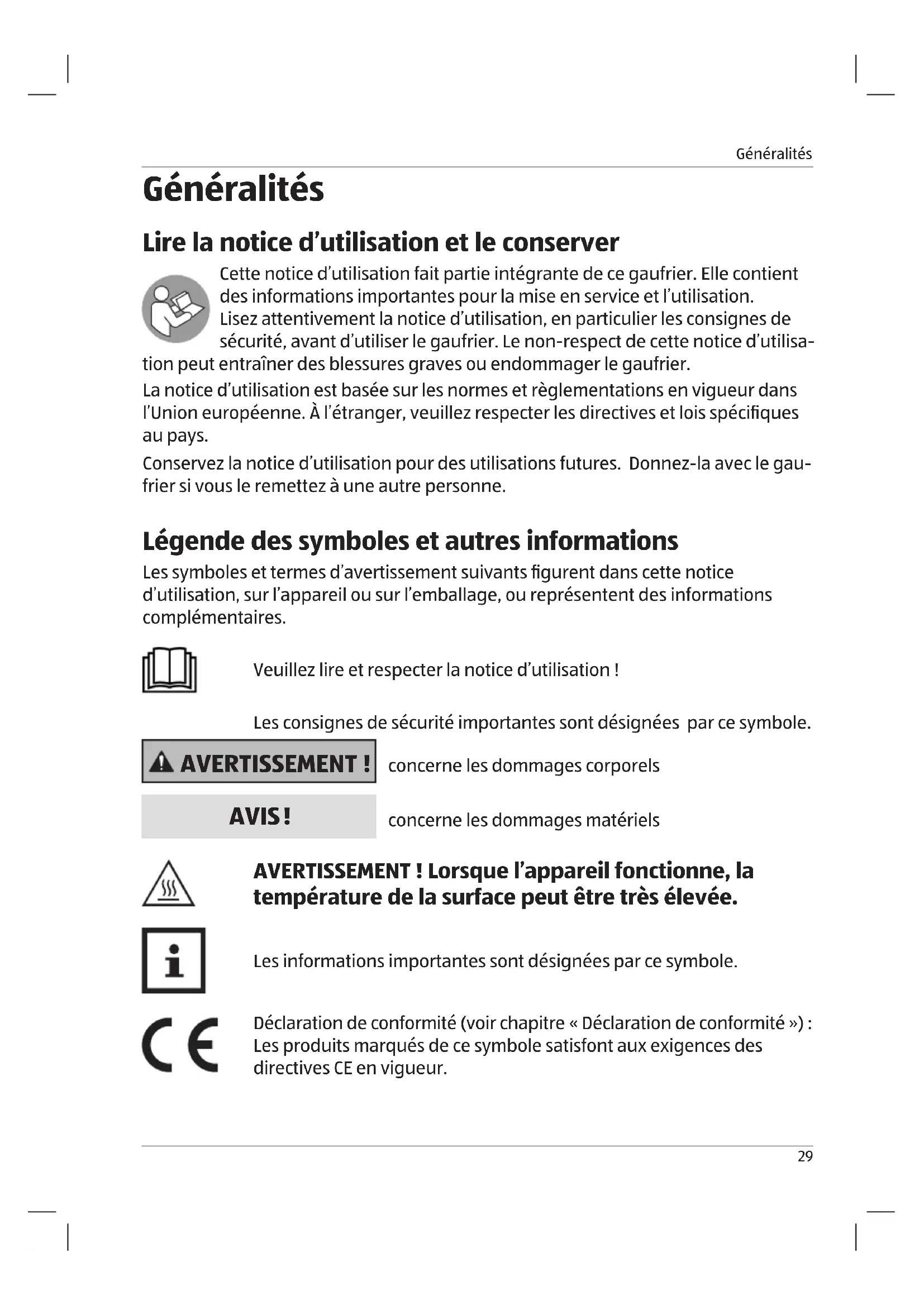 - Lire le mode d’emploi et le conserver p. 29
