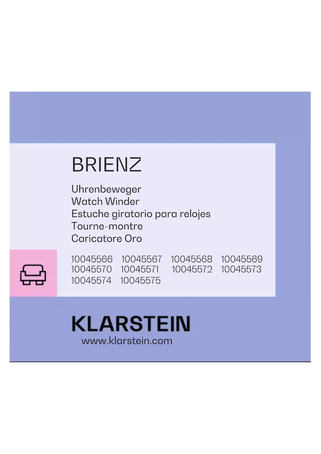 - Interrupteur ON/OFF : Lumière d'ambiance marche/arrêtFOIRE AUX QUESTIONS (1) Vous ne trouvez pas l'adaptateur secteur ? Ce produit est livré sans adaptateur secteur mais avec un cordon d'alimentation USB. Connectez l'adaptateur secteur de votre téléphone portable à ce câble d'alimentation USB pour faire fonctionner le produit. (2) Pourquoi le remontoir de montre ne tourne pas ? Vériez que le cordon d'alimentation est correctement xé au remontoir de montre. Vériez que votre adaptateur est correctement connecté au secteur. Vériez que l'interrupteur à bouton sous le plateau tournant du remontoir est en position de marche. (3) Pourquoi le remontoir de montre s'arrête-t-il après quelques minutes ? Habituellement, il se remet à tourner au bout de quelques minutes (selon le programme). Si cela ne fonctionne pas pendant une longue période, veuillez vérier les détails du programme déni. Dans le programme 4, il reste arrêté pendant 9 heures. De nombreux clients pensent alors à tort que le produit est défectueux. Au bout de 9 heures, le remontoir de montre redémarre et poursuit le programme. Si ce n'est pas le cas, veuillez lire les réponses à la question 2.(4) Le remontoir de montre ne peut pas remonter ma montre, pourquoi ? Tout d'abord, assurez-vous que votre montre mécanique dispose d'une fonction de remontage automatique du mouvement. Le programme 4 ne convient pas aux montres mécaniques à faible rendement, dans le pire des cas la montre peut se casser. (5) Comment installer correctement ma montre sur le support de montre ? Retirez le support en mousse à mémoire de forme du plateau tournant, placez votre montre autour de celui-ci, fermez le bracelet et placez le support dans la rainure. Si vous ne pouvez pas mettre votre montre normalement autour du support (parce que le bracelet est trop court), serrez bien la boucle de la montre car la mousse à mémoire de forme peut se déformer. (6) Pourquoi n'y a-t-il pas de compartiment à piles dans le remontoir de montre ? Ce produit est équipé d'un cordon d'alimentation USB, il peut donc être chargé par l'adaptateur secteur du téléphone portable ou une batterie externe, plusieurs fois plus durable et économique qu'une pile. La capacité de charge du remontoir de montre est d'environ 1500-2100 mA (jusqu'à cinq piles conventionnelles de 1,5 V). Une batterie externe classique a une capacité d'environ 10000 à 20000 mA, vous pouvez donc l'utiliser pour des charges répétées.INFORMATIONS SUR LE RECYCLAGE Si l'élimination des appareils électriques et électroniques est réglementée dans votre pays, ce symbole sur le produit ou sur l'emballage PIÈCEique qu'il ne doit pas être mis au rebut avec les ordures ménagères. Vous devez l'acheminer vers un point de collecte pour le recyclage des appareils électriques et électOIniques. En respectant des règles de recyclage, vous protégez l'environnement et la santé de vos semblables des conséquences négatives. Pour plus d'informations sur le recyclage et l'élimination de ce produit, contactez votre autorité locale ou votre service d'élimination des déchets ménagers. Ce produit contient des piles. S'il existe une réglementation légale pour la mise au rebut des piles dans votre pays, ne les jetez pas avec les ordures ménagères Renseignez-vous sur les réglementations locales concernant la mise au rebut des piles. En respectant des règles de recyclage, vous protégez l'environnement et la santé de vos semblables des conséquences négatives.FABRICANT ET IMPORTATEUR (GB) Fabricant : Chal-Tec GmbH, Wallstraße 16, 10179 Berlin, Allemagne. Importateur pour la Grande Bretagne : Berlin Brands Group UK Ltd PO Box 42 272 Kensington High Street London, W8 6ND United KingdomFICHE TECHNIQUE Numéro d'article Alimentation Nombre de montres 10045566 220-240 V ~ 50/60 Hz 1 10045567 220-240 V ~ 50/60 Hz 2 10045568 220-240 V ~ 50/60 Hz 1 10045569 220-240 V ~ 50/60 Hz 1 10045570 220-240 V ~ 50/60 Hz 1 10045571 220-240 V ~ 50/60 Hz 1 10045572 220-240 V ~ 50/60 Hz 1 10045573 220-240 V ~ 50/60 Hz 1 10045574 220-240 V ~ 50/60 Hz 2 10045575 220-240 V ~ 50/60 Hz 1Gentile cliente, La ringraziamo per l'acquisto del dispositivo. La preghiamo di leggere attentamente le seguenti indicazioni e di seguirle per evitare eventuali danni. Non ci assumiamo alcuna responsabilità per danni scaturiti da una mancata osservanza delle avvertenze di sicurezza e da un uso improprio del dispositivo. Scansionare il seguente codice QR per accedere al manuale d'uso più recente e ricevere informazioni sul prodotto.PANORAMICA (10045568,10045575,10045567,10045573) (1) Collegamento alla rete elettrica (2) Interruttore della luce ambiente (3) Interruttore dei programmi (4) Supporto per gli orologi (5) Piatto rotante (6) Cavo USB (7) Panno per pulire (8) Luce LED blu (9) Interruttore del piatto rotante destro1