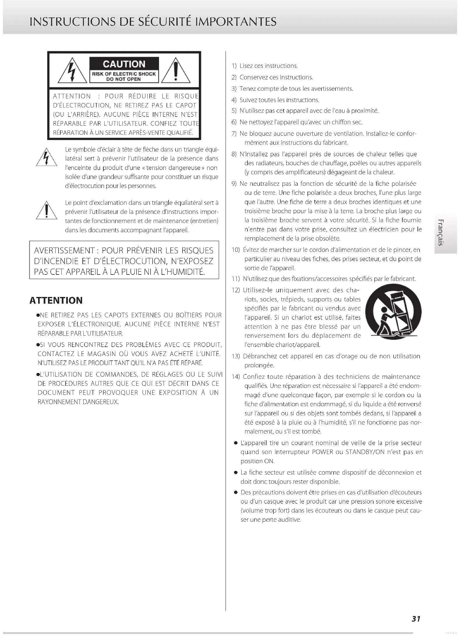D’INCENDIE ET D’ÉLECTROCUTION, N’EXPOSEZ PAS CET APPAREIL À LA PLUIE NI À L’HUMIDITÉ. ATTENTION o NE RETIREZ PAS LES CAPOTS EXTERNES OU BOÎTIERS POUR EXPOSER L’ÉLECTRONIQUE. AUCUNE PIÈCE INTERNE N’EST RÉPARABLE PAR L’UTILISATEUR. o SI VOUS RENCONTREZ DES PROBLÈMES AVEC CE PRODUIT, CONTACTEZ LE MAGASIN OÙ VOUS AVEZ ACHETÉ L’UNITÉ. N’UTILISEZ PAS LE PRODUIT TANT QU’IL N’A PAS ÉTÉ RÉPARÉ. o L’UTILISATION DE COMMANDES, DE RÉGLAGES OU LE SUIVI DE PROCÉDURES AUTRES QUE CE QUI EST DÉCRIT DANS CE DOCUMENT PEUT PROVOQUER UNE EXPOSITION À UN RAYONNEMENT DANGEREUX.1) Lisez ces instructions.2) Conservez ces instructions.3) Tenez compte de tous les avertissements.4) Suivez toutes les instructions.5) N’utilisez pas cet appareil avec de l’eau à proximité.6) Ne nettoyez l’appareil qu’avec un chiffon sec.7) Ne bloquez aucune ouverture de ventilation. Installez-le confor-mément aux instructions du fabricant.8) N’installez pas l’appareil près de sources de chaleur telles que des radiateurs, bouches de chauffage, poêles ou autres appareils (y compris des amplificateurs) dégageant de la chaleur.9) Ne neutralisez pas la fonction de sécurité de la fiche polarisée ou de terre. Une fiche polarisée a deux broches, l’une plus large que l’autre. Une fiche de terre a deux broches identiques et une troisième broche pour la mise à la terre. La broche plus large ou la troisième broche servent à votre sécurité. Si la fiche fournie n’entre pas dans votre prise, consultez un électricien pour le remplacement de la prise obsolète.10) Évitez de marcher sur le cordon d’alimentation et de le pincer, en particulier au niveau des fiches, des prises secteur, et du point de sortie de l’appareil.11) N’utilisez que des fixations/accessoires spécifiés par le fabricant.12) Utilisez-le uniquement avec des cha-riots, socles, trépieds, supports ou tables spécifiés par le fabricant ou vendus avec l’appareil. Si un chariot est utilisé, faites attention à ne pas être blessé par un renversement lors du déplacement de l’ensemble chariot/appareil.13) Débranchez cet appareil en cas d’orage ou de non utilisation prolongée.14) Confiez toute réparation à des techniciens de maintenance qualifiés. Une réparation est nécessaire si l’appareil a été endom-magé d’une quelconque façon, par exemple si le cordon ou la fiche d’alimentation est endommagé, si du liquide a été renversé sur l’appareil ou si des objets sont tombés dedans, si l’appareil a été exposé à la pluie ou à l’humidité, s’il ne fonctionne pas nor-malement, ou s’il est tombé. o L’appareil tire un courant nominal de veille de la prise secteur quand son interrupteur POWER ou STANDBY/ON n’est pas en position ON. o La fiche secteur est utilisée comme dispositif de déconnexion et doit donc toujours rester disponible. o Des précautions doivent être prises en cas d’utilisation d’écouteurs ou d’un casque avec le produit car une pression sonore excessive (volume trop fort) dans les écouteurs ou dans le casque peut cau-ser une perte auditive.32 INSTRUCTIONS DE SÉCURITÉ IMPORTANTES (suite) AVERTISSEMENT Les produits ayant une construction de Classe ! sont équipés d’un cordon d’alimentation avec une fiche de terre. Le cordon d’un tel produit doit être branché dans une prise secteur avec terre de sécurité. AUX USA/CANADA, UTILISEZ UNIQUEMENT UNE TENSION D’ALIMENTATION DE 120V. ATTENTION o N’exposez pas cet appareil aux gouttes ni aux éclaboussures. o Ne placez pas d’objet rempli de liquide sur l’appareil, comme par exemple un vase. o N’installez pas cet appareil dans un espace confiné comme une bibliothèque ou un meuble similaire. o L’appareil doit être placé suffisamment près de la prise de cou- rant pour que vous puissiez à tout moment attraper facilement la fiche du cordon d’alimentation. o Si le produit utilise des piles/batteries (y compris un pack de batteries ou des piles installées), elles ne doivent pas être exposées au soleil, au feu ou à une chaleur excessive. o PRÉCAUTION pour les produits qui utilisent des batteries rem- plaçables au lithium: remplacer une batterie par un modèle incorrect entraîne un risque d’explosion. Remplacez-les uni- quement par un type identique ou équivalent. V Précautions concernant les piles Un mauvais emploi des piles peut entraîner leur rupture ou leur fuite, avec pour conséquence un incendie, des blessures ou la salissure des objets proches. Veuillez lire et suivre attentivement les précautions suivantes. o Veillez à insérer les piles avec leurs pôles positif (¥) et négatif (^) correctement orientés. o Utilisez des piles du même type. N’utilisez jamais des types de pile différents ensemble. o Si la télécommande doit rester inutilisée durant une période pro- longée (plus d’un mois), retirez ses piles pour éviter qu’elles ne coulent. o Si les piles coulent, essuyez le liquide dans le compartiment des piles et remplacez les piles par des neuves. o N’utilisez pas de piles d’un type autre que celui spécifié. Ne mélan- gez pas des piles neuves avec des anciennes et n’utilisez pas ensemble des types de pile différents. o Ne chauffez pas et ne démontez pas les piles. Ne jetez jamais les piles dans un feu ou dans de l’eau. o Ne conservez et ne transportez pas les piles avec d’autres objets métalliques. Les piles pourraient entrer en court-circuit, couler ou exploser. o Ne rechargez jamais une batterie sans avoir vérifié qu’elle peut l’être. o N’exposez pas les piles à une pression d’air extrêmement basse car cela pourrait entraîner une explosion ou une fuite de liquides ou de gaz inflammables. Modèle pour le Canada CET APPAREIL NUMÉRIQUE DE LA CLASSE B EST CONFORME À LA