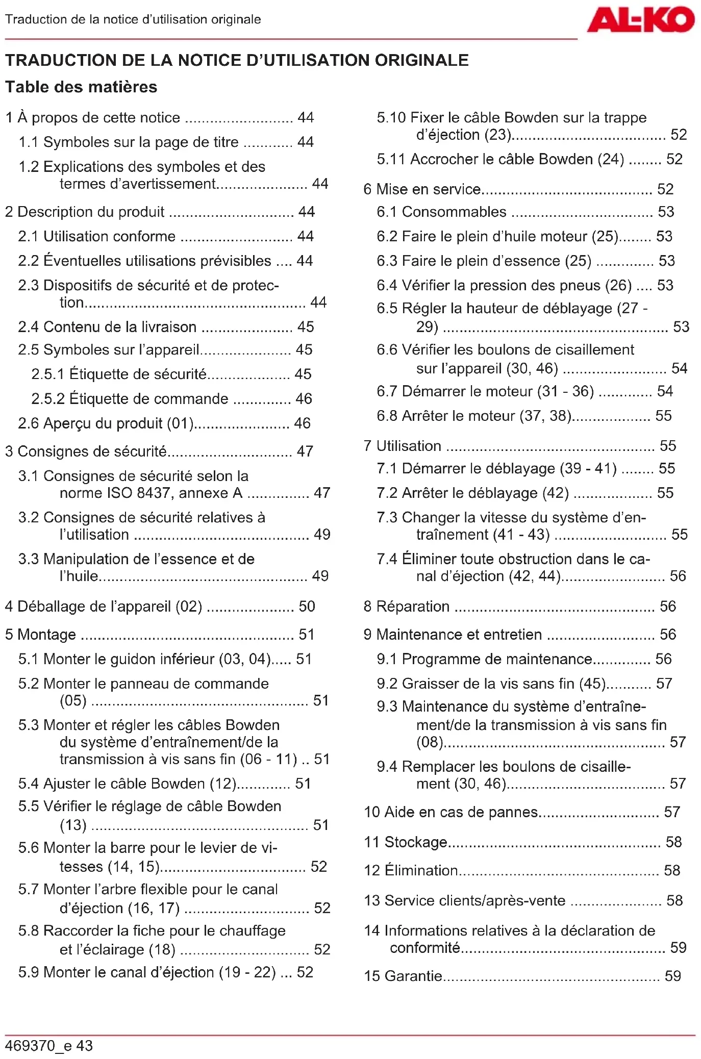 L’aperçu du produit (01) donne une vue d’en- semble de l’appareil. N° Pièce 1 Poignées chauffantes 2 Levier d’embrayage de la transmission à vis sans fin 3 Levier d’embrayage du système d’en- traînement 4 Manivelle de réglage de la direction d’éjection 5 Levier de commande de la hauteur d’éjection 6 Levier de vitesses, 6 vitesses en marche avant et 2 vitesses en marche arrière 7 Interrupteur de chauffage des poignées469370_e 47 Consignes de sécurité N° Pièce 8 Boulons de cisaillement de rechange 9 Déflecteur sur le canal d’éjection pour le réglage de la hauteur d’éjection 10 Canal d’éjection avec protection 11 Éclairage 12 Bouchon du réservoir 13 Bouchon de remplissage d’huile 14 Bouclier 15 Outil de nettoyage (fixé sur le bouclier) 16 Roue d’éjection 17 Vis sans fin 18 Plaque de déblayage 19 Patins réglables en hauteur 20 Cosse de bougie