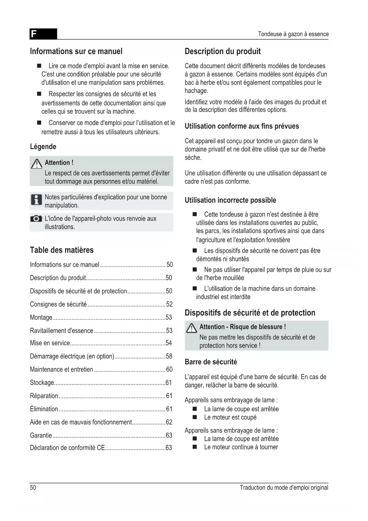 - Tondeuse à gazon à essence Table des matières Informations sur ce manuel p. 50