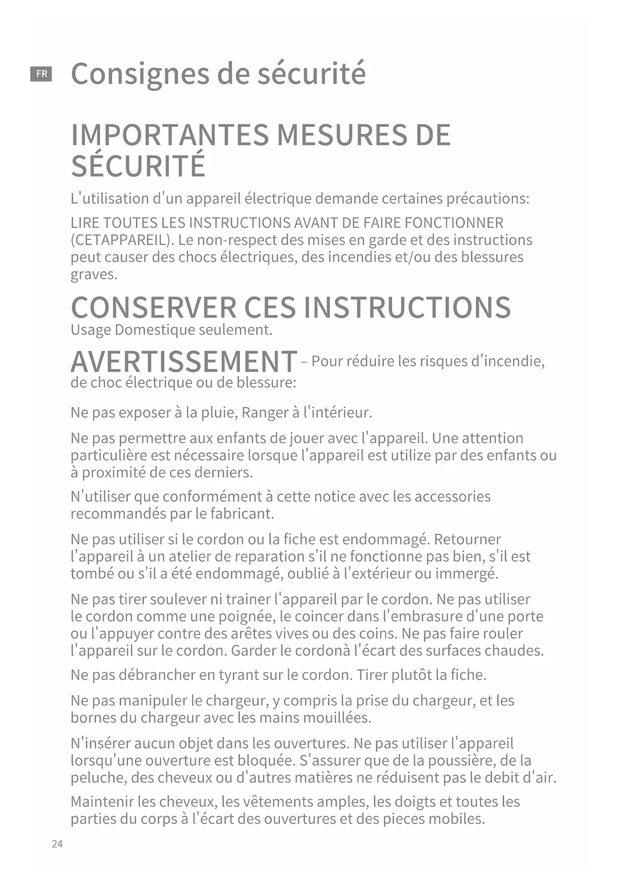 Usage Domestique seulement. AVERTISSEMENT – Pour réduire les risques d'incendie, de choc électrique ou de blessure: Ne pas exposer à la pluie, Ranger à l'intérieur. Ne pas permettre aux enfants de jouer avec l'appareil. Une attention particulière est nécessaire lorsque l'appareil est utilize par des enfants ou à proximité de ces derniers. N'utiliser que conformément à cette notice avec les accessories recommandés par le fabricant. Ne pas utiliser si le cordon ou la fiche est endommagé. Retourner l'appareil à un atelier de reparation s'il ne fonctionne pas bien, s'il est tombé ou s'il a été endommagé, oublié à l'extérieur ou immergé. Ne pas tirer soulever ni trainer l'appareil par le cordon. Ne pas utiliser le cordon comme une poignée, le coincer dans l'embrasure d'une porte ou l'appuyer contre des arêtes vives ou des coins. Ne pas faire rouler l'appareil sur le cordon. Garder le cordonà l'écart des surfaces chaudes. Ne pas débrancher en tyrant sur le cordon. Tirer plutôt la fiche. Ne pas manipuler le chargeur, y compris la prise du chargeur, et les bornes du chargeur avec les mains mouillées. N'insérer aucun objet dans les ouvertures. Ne pas utiliser l'appareil lorsqu'une ouverture est bloquée. S'assurer que de la poussière, de la peluche, des cheveux ou d'autres matières ne réduisent pas le debit d'air. Maintenir les cheveux, les vêtements amples, les doigts et toutes les parties du corps à l'écart des ouvertures et des pieces mobiles. Consignes de sécurité25