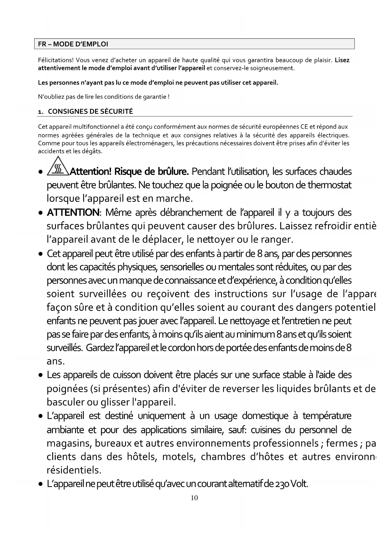 Cet appareil multifonctionnel a été conçu conformément aux normes de sécurité européennes CE et répond aux normes agréées générales de la technique et aux consignes relatives à la sécurité des appareils électriques. Comme pour tous les appareils électroménagers, les précautions nécessaires doivent être prises afin d’éviter les accidents et les dégâts.