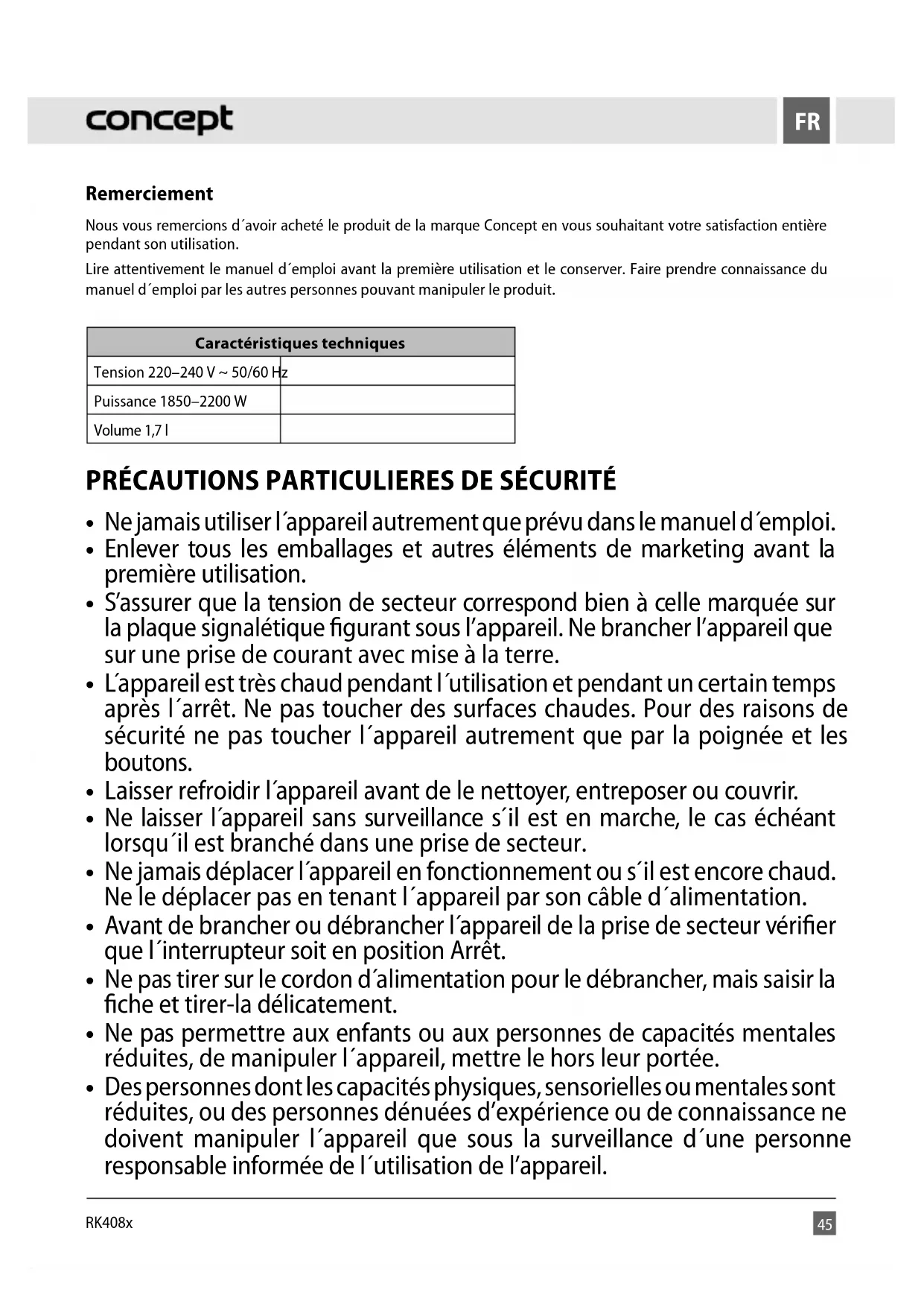 Remerciement Nous vous remercions d´avoir acheté le produit de la marque Concept en vous souhaitant votre satisfaction entière pendant son utilisation. Lire attentivement le manuel d´emploi avant la première utilisation et le conserver. Faire prendre connaissance du manuel d´emploi par les autres personnes pouvant manipuler le produit. Caractéristiques techniques Tension 220–240 V ~ 50/60 Hz Puissance 1850–2200 W Volume 1,7 l