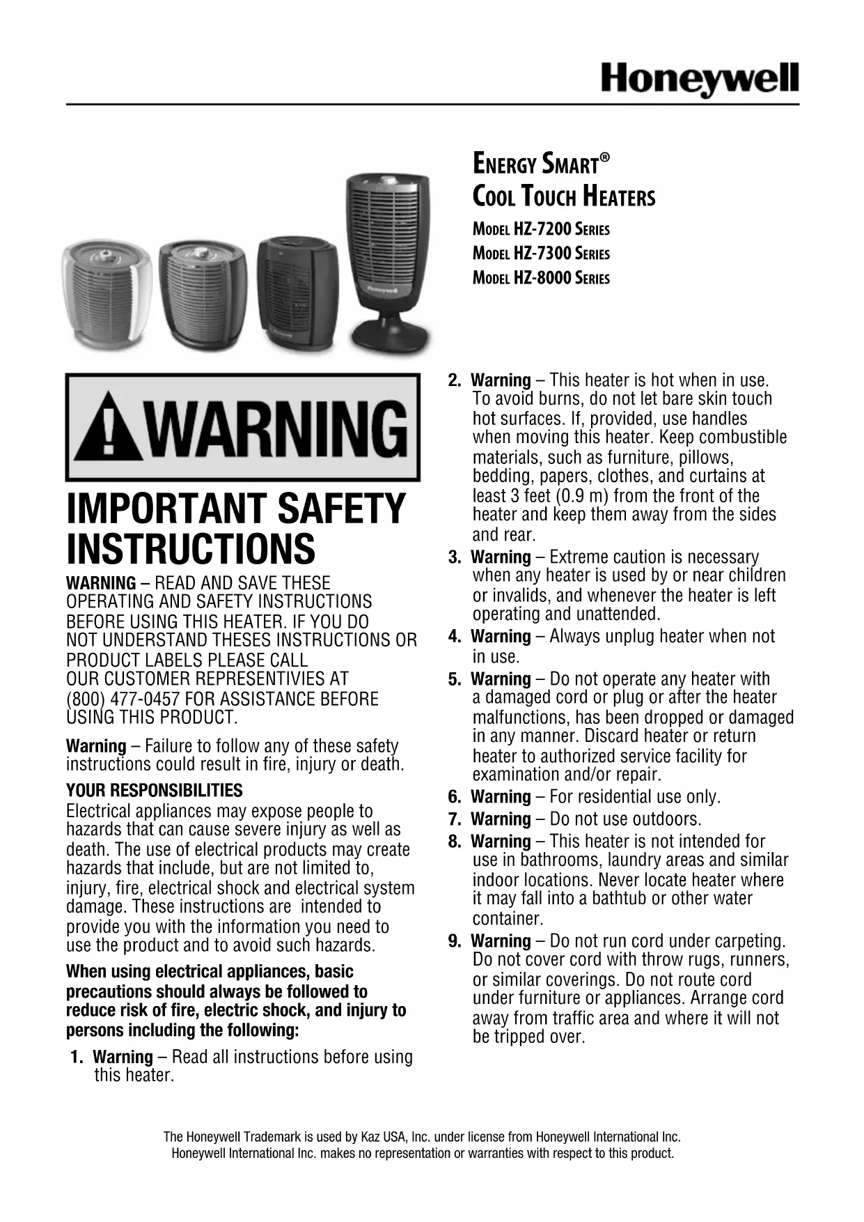 modèlES dE la SériE hZ-7200 modèlES dE la SériE hZ-7300 modèlES dE la SériE hZ-8000 Kaz USA, Inc. utilise la marque de commerce Honeywell avec l’autorisation de Honeywell International Inc.Honeywell International Inc. ne fait aucune assertion et n’offre aucune garantie en ce qui concerne ce produit.14 15
