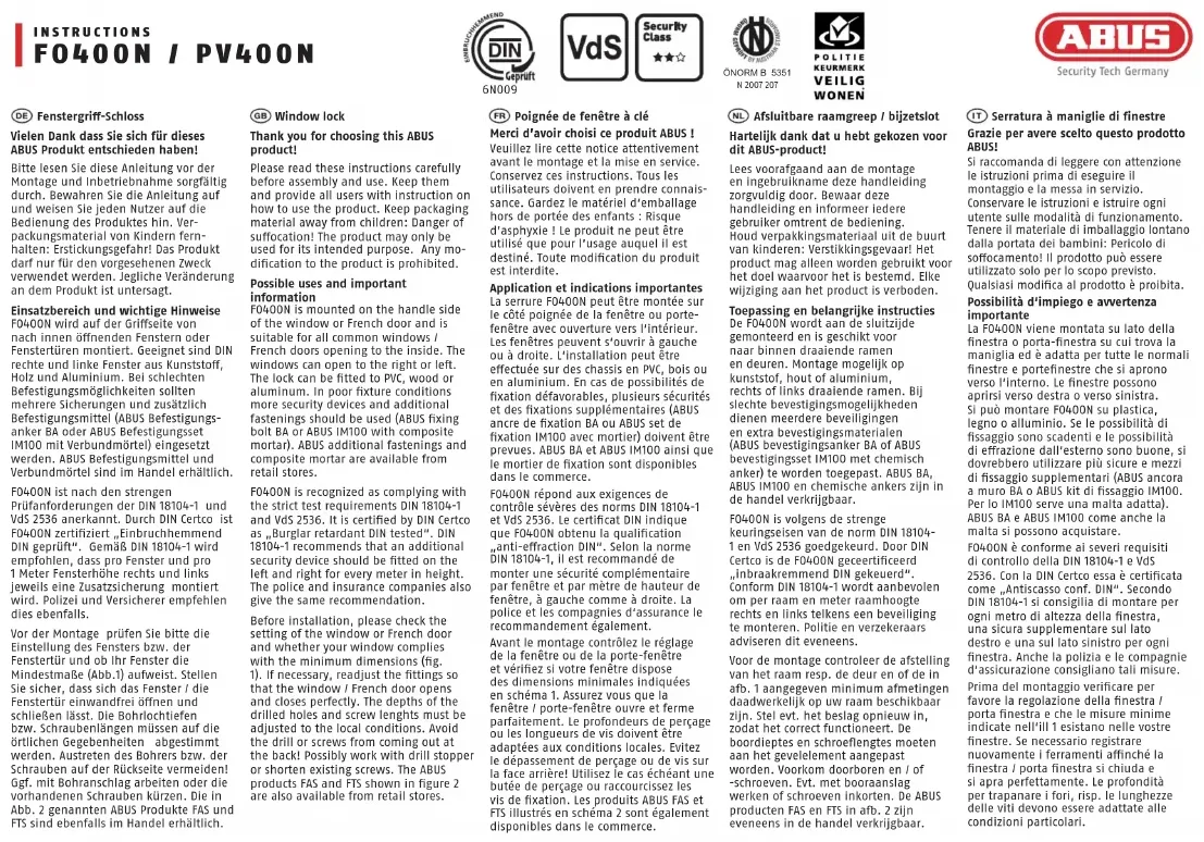 Téléchargez la notice de votre Serrure au format PDF gratuitement ! Retrouvez votre notice FO400N - ABUS et reprennez votre appareil électronique en main. Sur cette page sont publiés tous les documents nécessaires à l'utilisation de votre appareil FO400N de la marque ABUS.