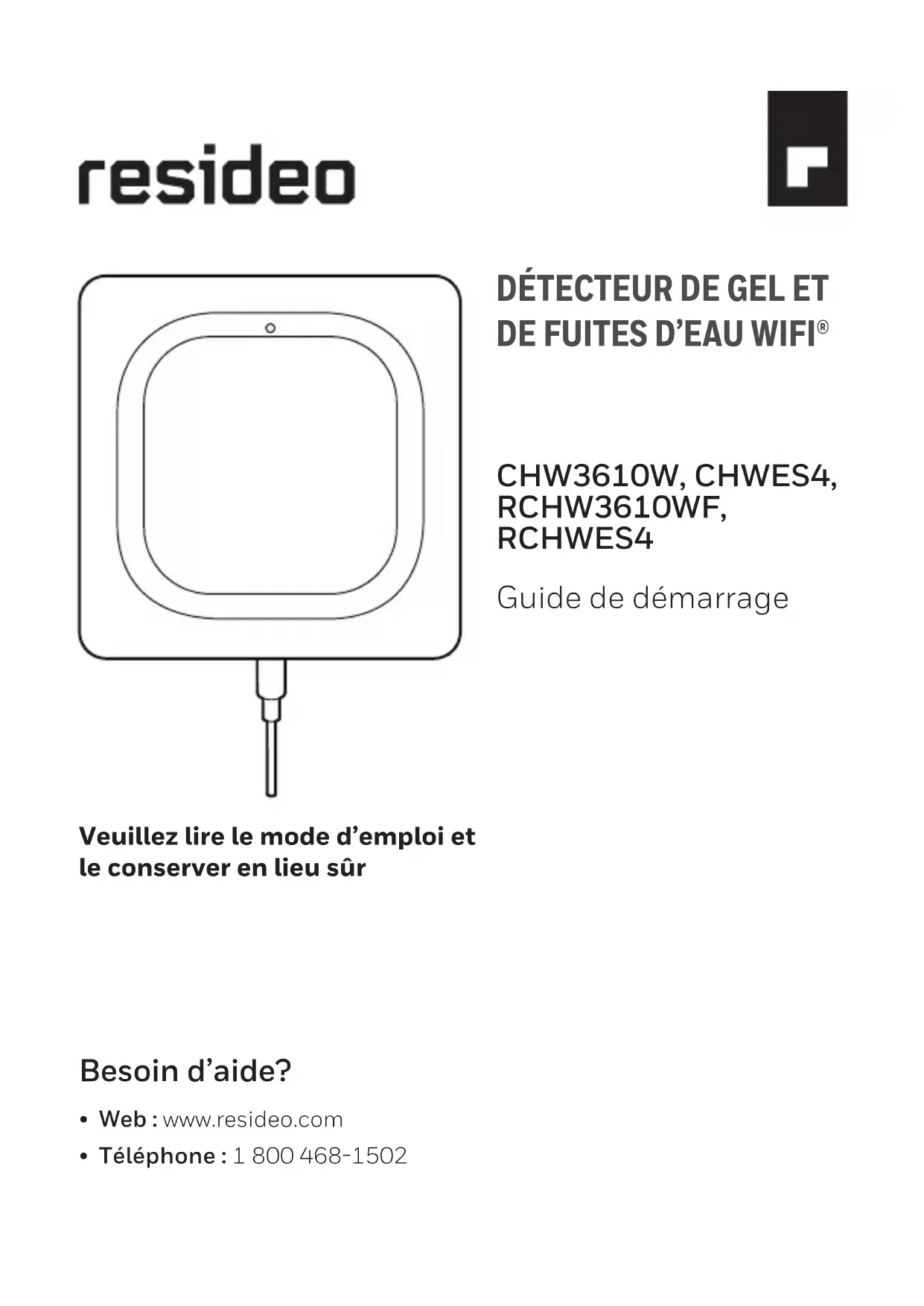 1 Téléchargez l’application Honeywell Home Recherchez l’application Honeywell Home dans l’App Store ou Google Play. Après le téléchargement, lancez l’application, inscrivez-vous (le cas échéant), puis cliquez sur Menu et Add New Device (Ajouter un nouvel appareil). 2 Installez les piles Le détecteur est alimenté par 3 piles AA (fournies). Ouvrez le couvercle du compartiment des piles du détecteur et installez les piles. Pour remettre le couvercle en place, appuyez fermement sur les bords pour bien ajuster. Remarque : La prise du câble de détection n’est PAS conçue pour être branchée dans un adaptateur de courant. Vous risqueriez d’endommager le détecteur. Prise du câble de détection11 3 Connectez-vous Appariez et identifiez votre détecteur 1 Sous Add New Device (Ajouter un nouvel appareil), sélectionnez Water Leak and Freeze Detector (Détecteur de gel et de fuites d’eau). Remarque : Assurez-vous que la fonction Bluetooth est activée sur votre appareil mobile et que le voyant DEL du détecteur clignote en bleu. Sinon, consultez la section Réinitialisation. 2 Fournissez un emplacement pour votre détecteur. Appuyez sur NEXT (suivant). 3 Le détecteur se connecte maintenant à l’application. Remarque : Si vous avez plus d’un détecteur, vous devrez connecter chaque détecteur individuellement. 4 Une alerte sonore retentira et le voyant DEL du détecteur passera au bleu en continu pour indiquer que le détecteur est apparié. Appuyez sur NEXT (suivant). 5 Créez un nom pour le détecteur ou sélectionnez-en un dans la liste. Appuyez sur NEXT (suivant).12 Branchez-vous au réseau WiFi 1 Choisissez votre réseau dans la liste. Appuyez sur NEXT (suivant). 2 Saisissez votre mot de passe WiFi, au besoin. Appuyez sur NEXT (suivant). 3 Une fois la connexion au réseau WiFi obtenue, le voyant DEL s’allume en vert en continu pendant 5 minutes puis s’éteint pour conserver les piles. Remarque : Si vous retirez les piles du détecteur et que vous les remplacez, le détecteur se reconnectera automatiquement à votre réseau WiFi. 4 Configurez Continuez à suivre les instructions de l’application pour configurer votre détecteur. Sélectionnez les niveaux d’alerte désirés pour les avertissements d’humidité élevée, d’humidité basse et de température, ou gardez les réglages prédéfinis. Identifier les personnes que vous voudriez avertir en cas d’alerte. Ces réglages peuvent être mis à jour à tout moment à l’aide de l’application.13 Capteurs Trou de montage en forme de serrure Prise du câble de détection Bouchon 5 Positionnement Placez le bas du détecteur à plat sur le plancher ou sur une surface. Pour le montage sur un mur, utilisez la vis incluse et suspendez le détecteur dans le trou de montage en forme de serrure situé sur la partie inférieure du couvercle. Câble de détection en option Pour installer le câble de détection en option, retirez le bouchon et insérez le câble de détection. Insérez le bouchon dans l’extrémité du câble de détection. Des câbles de détection d’accessoires (vendus séparément) peuvent être raccordés pour allonger le câble et ainsi augmenter l’étendue de la zone de détection de l’eau. Vous pouvez suspendre le détecteur sur le mur ou placer le détecteur et le câble de détection sur le plancher. Remarque : La prise du câble de détection n’est PAS conçue pour être branchée dans un adaptateur d’alimentation. Vous risqueriez d’endommager le détecteur.14 Utilisations courantes Fonctionnement Expérience avec l’application Honeywell Home Vous trouverez ci-dessous quelques exemples des écrans de l’application Honeywell Home qui s’afficheront lorsque vous utiliserez le détecteur de gel et de fuites d’eau. Fuite détectée par l’appareil Tendances de température sur 30 jours Basse température détectée par l’appareil Échec de la connexion WiFi15 Réinitialisation Utilisez l’extrémité d’un trombone pour appuyer dans l’orifice de réinitialisation pendant 5 secondes pour réinitialiser la connexion WiFi, les réglages du détecteur et l’appairage Bluetooth. Le voyant DEL passera au bleu en continu. Appuyez l’extrémité d’un trombone dans l’orifice de réinitialisation pendant 15 secondes pour rétablir les réglages par défaut d’usine. Le voyant DEL passera au bleu en continu. Voyant DEL d’état Le détecteur dispose d’un voyant DEL qui indique l’état de l’appareil. DEL État du détecteur Durant l’installation Émet un clignotement bleu Se met sous tension et se connecte au Bluetooth. S’allume en continu en bleu Est apparié avec Bluetooth. Émet un clignotement vert Se connecte au réseau WiFi. S’allume en continu en vert Est sous tension, connecté au réseau WiFi et fonctionne normalement. Remarque : Le voyant DEL s’éteint après 5 minutes pour conserver les piles. S’allume en continu en rouge Se connecter au réseau WiFi. Durant le fonctionnement Émet un clignotement rouge Le détecteur a détecté une fuite ou n’a pas réussi. En cas d’alerte Pour conserver les piles, le détecteur peut nécessiter jusqu’à 1 minute pour détecter une fuite. Il est possible d’éteindre le son du détecteur en appuyant sur le bouton Mute (silence) dans l’application ou en retirant les piles ou le câble de détection du détecteur. La fonction de silence peut nécessiter jusqu’à 1 minute pour atteindre le détecteur. Une fois que vous avez identifié la cause de l’alerte, essuyez le détecteur et le câble de détection et les remettre en place. Replacez les piles si elles ont été ôtées.www.resideo.com © 2020 Resideo Technologies, Inc. All rights reserved. The Honeywell Home trademark is used under license from Honeywell International, Inc. This product is manufactured by Resideo Technologies, Inc. and its affiliates. Tous droits réservés. La marque de commerce Honeywell Home est utilisée avec l’auto