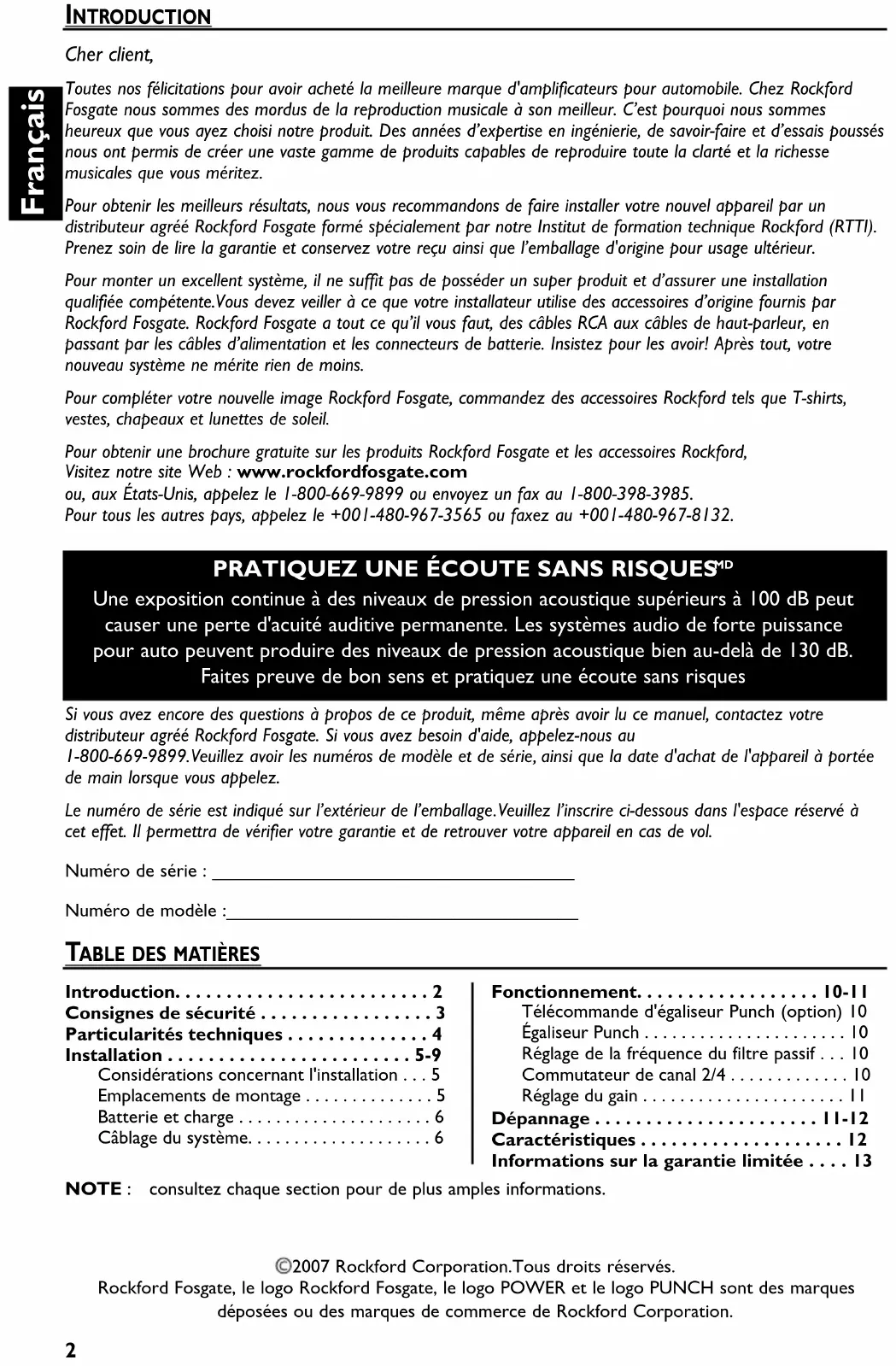 - Une exposition continue à des niveaux de pression acoustique supérieurs à 100 dB peut causer une perte d'acuité auditive permanente. Les systèmes audio de forte puissance pour auto peuvent produire des niveaux de pression acoustique bien au-delà de 130 dB. Faites preuve de bon sens et pratiquez une écoute sans risques NOTE : consultez chaque section pour de plus amples informations. Si vous avez encore des questions à propos de ce produit, même après avoir lu ce manuel, contactez votre distributeur agréé Rockford Fosgate. Si vous avez besoin d'aide, appelez-nous au 1-800-669-9899.Veuillez avoir les numéros de modèle et de série, ainsi que la date d'achat de l'appareil à portée de main lorsque vous appelez. Le numéro de série est indiqué sur l’extérieur de l’emballage.Veuillez l’inscrire ci-dessous dans l'espace réservé à cet effet. Il permettra de vérifier votre garantie et de retrouver votre appareil en cas de vol. Numéro de série : ___________________________________ Numéro de modèle :__________________________________ Introduction p. 2