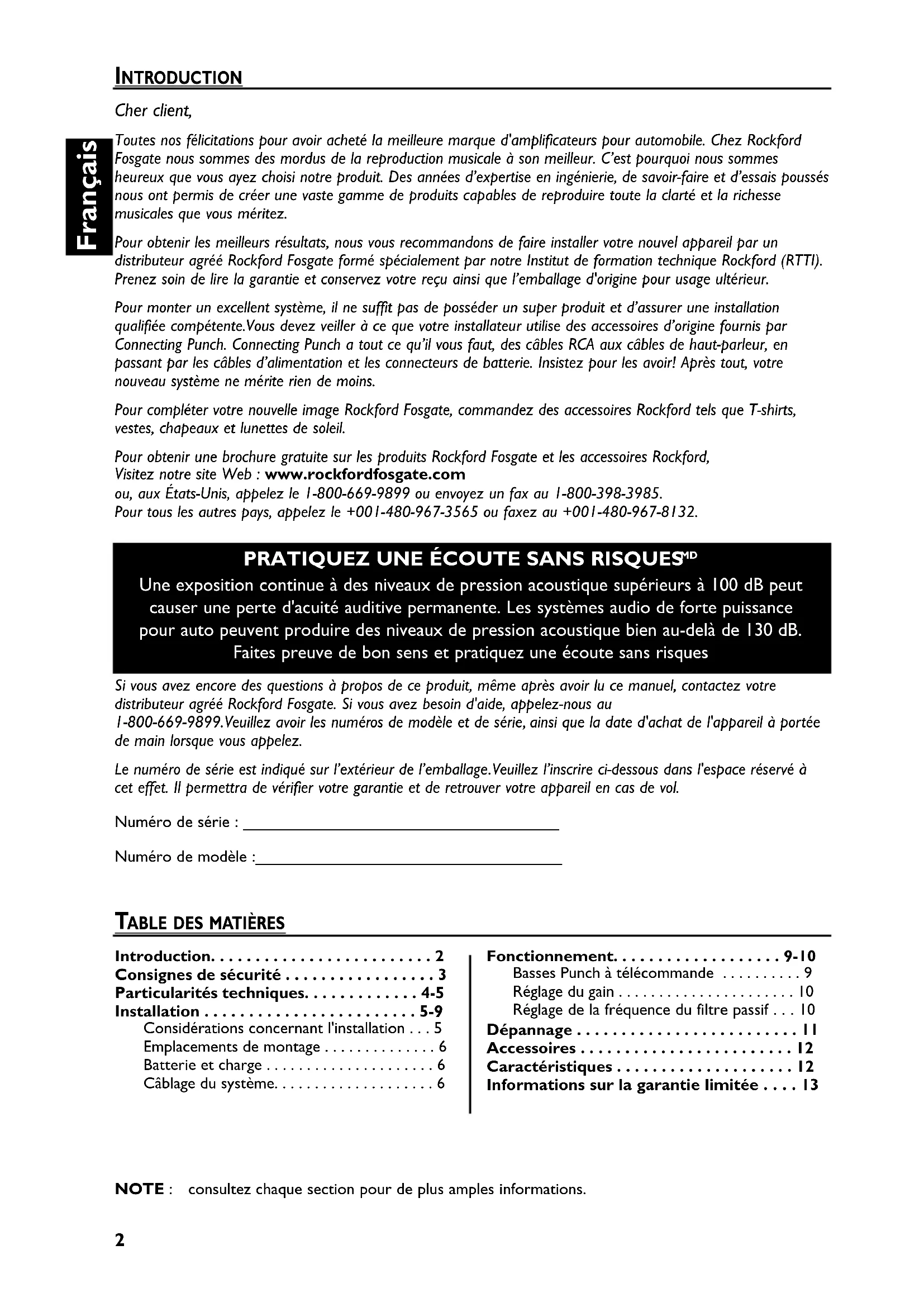 - Une exposition continue à des niveaux de pression acoustique supérieurs à 100 dB peut causer une perte d'acuité auditive permanente. Les systèmes audio de forte puissance pour auto peuvent produire des niveaux de pression acoustique bien au-delà de 130 dB. Faites preuve de bon sens et pratiquez une écoute sans risques NOTE : consultez chaque section pour de plus amples informations. Si vous avez encore des questions à propos de ce produit, même après avoir lu ce manuel, contactez votre distributeur agréé Rockford Fosgate. Si vous avez besoin d'aide, appelez-nous au 1-800-669-9899.Veuillez avoir les numéros de modèle et de série, ainsi que la date d'achat de l'appareil à portée de main lorsque vous appelez. Le numéro de série est indiqué sur l’extérieur de l’emballage.Veuillez l’inscrire ci-dessous dans l'espace réservé à cet effet. Il permettra de vérifier votre garantie et de retrouver votre appareil en cas de vol. Numéro de série : ___________________________________ Numéro de modèle :__________________________________ Introduction p. 2