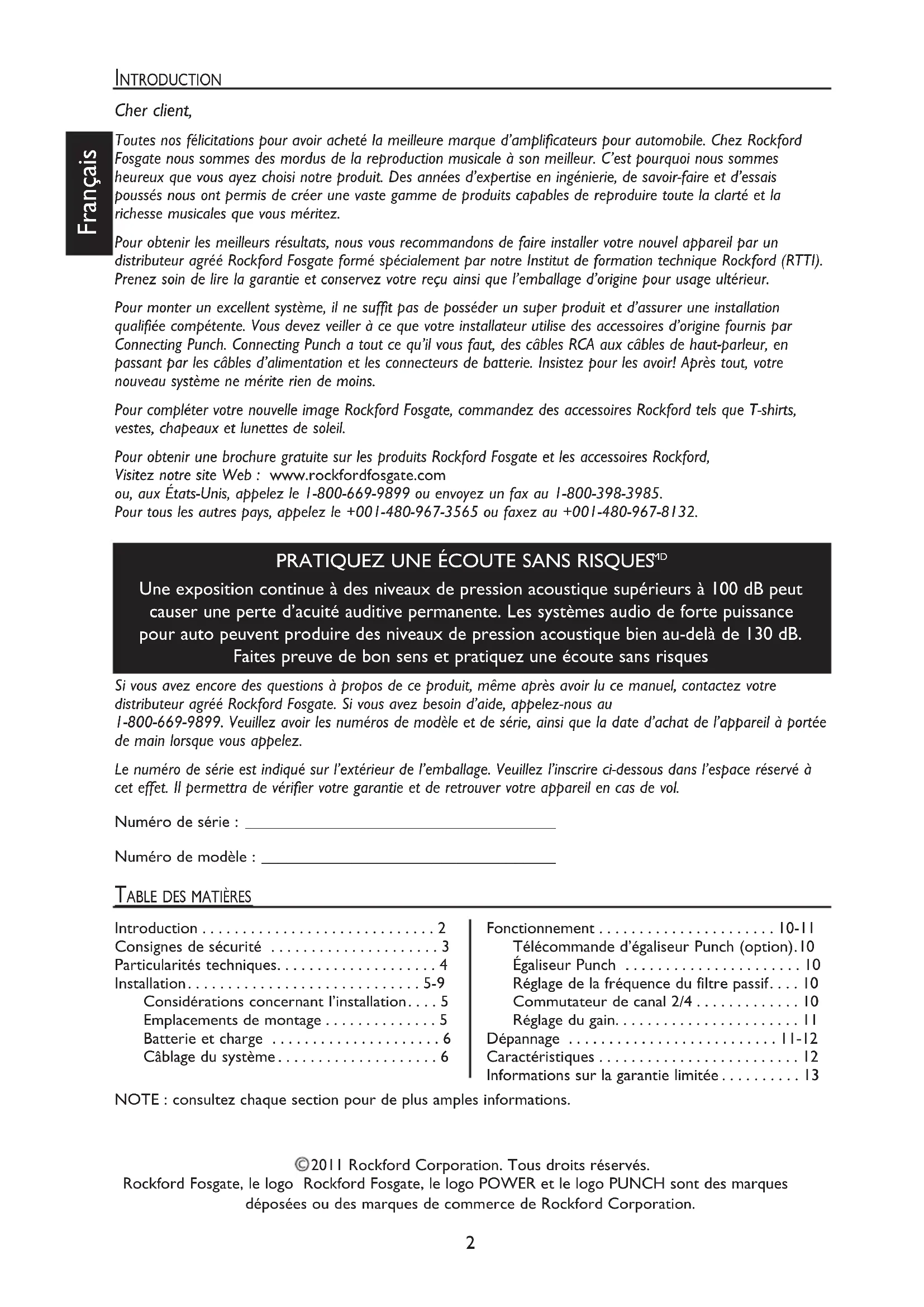 - Une exposition continue à des niveaux de pression acoustique supérieurs à 100 dB peut causer une perte d’acuité auditive permanente. Les systèmes audio de forte puissance pour auto peuvent produire des niveaux de pression acoustique bien au-delà de 130 dB. Faites preuve de bon sens et pratiquez une écoute sans risques NOTE : consultez chaque section pour de plus amples informations.Si vous avez encore des questions à propos de ce produit, même après avoir lu ce manuel, contactez votre distributeur agréé Rockford Fosgate. Si vous avez besoin d’aide, appelez-nous au 1-800-669-9899. Veuillez avoir les numéros de modèle et de série, ainsi que la date d’achat de l’appareil à portée de main lorsque vous appelez.Le numéro de série est indiqué sur l’extérieur de l’emballage. Veuillez l’inscrire ci-dessous dans l’espace réservé à cet effet. Il permettra de vérifier votre garantie et de retrouver votre appareil en cas de vol.Numéro de série : ______________________________________Numéro de modèle : ____________________________________Introduction p. 2
