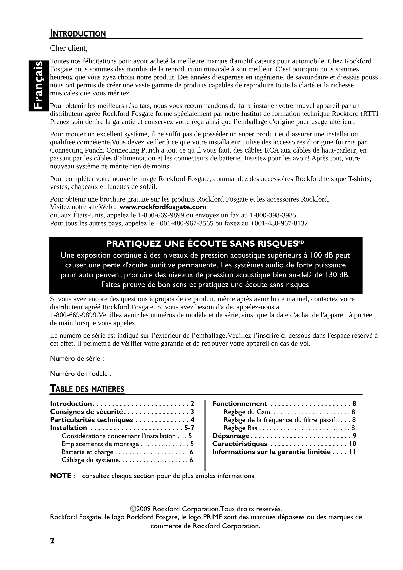 - Une exposition continue à des niveaux de pression acoustique supérieurs à 100 dB peut causer une perte d'acuité auditive permanente. Les systèmes audio de forte puissance pour auto peuvent produire des niveaux de pression acoustique bien au-delà de 130 dB. Faites preuve de bon sens et pratiquez une écoute sans risques NOTE : consultez chaque section pour de plus amples informations. Si vous avez encore des questions à propos de ce produit, même après avoir lu ce manuel, contactez votre distributeur agréé Rockford Fosgate. Si vous avez besoin d'aide, appelez-nous au 1-800-669-9899.Veuillez avoir les numéros de modèle et de série, ainsi que la date d'achat de l'appareil à portée de main lorsque vous appelez. Le numéro de série est indiqué sur l’extérieur de l’emballage.Veuillez l’inscrire ci-dessous dans l'espace réservé à cet effet. Il permettra de vérifier votre garantie et de retrouver votre appareil en cas de vol. Numéro de série : ___________________________________ Numéro de modèle :__________________________________ Introduction p. 2