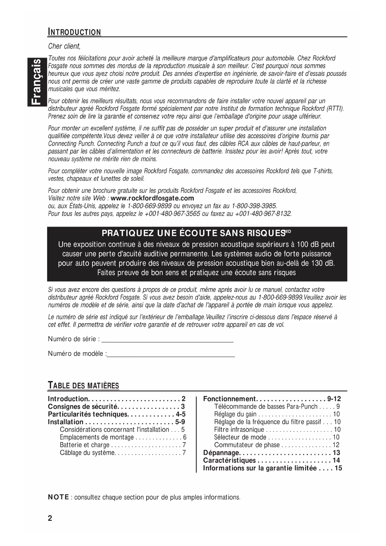 - Une exposition continue à des niveaux de pression acoustique supérieurs à 100 dB peut causer une perte d'acuité auditive permanente. Les systèmes audio de forte puissance pour auto peuvent produire des niveaux de pression acoustique bien au-delà de 130 dB. Faites preuve de bon sens et pratiquez une écoute sans risques NOTE : consultez chaque section pour de plus amples informations. Si vous avez encore des questions à propos de ce produit, même après avoir lu ce manuel, contactez votre distributeur agréé Rockford Fosgate. Si vous avez besoin d'aide, appelez-nous au 1-800-669-9899.Veuillez avoir les numéros de modèle et de série, ainsi que la date d'achat de l'appareil à portée de main lorsque vous appelez. Le numéro de série est indiqué sur l’extérieur de l’emballage.Veuillez l’inscrire ci-dessous dans l'espace réservé à cet effet. Il permettra de vérifier votre garantie et de retrouver votre appareil en cas de vol. Numéro de série : ___________________________________ Numéro de modèle :__________________________________ Introduction p. 2