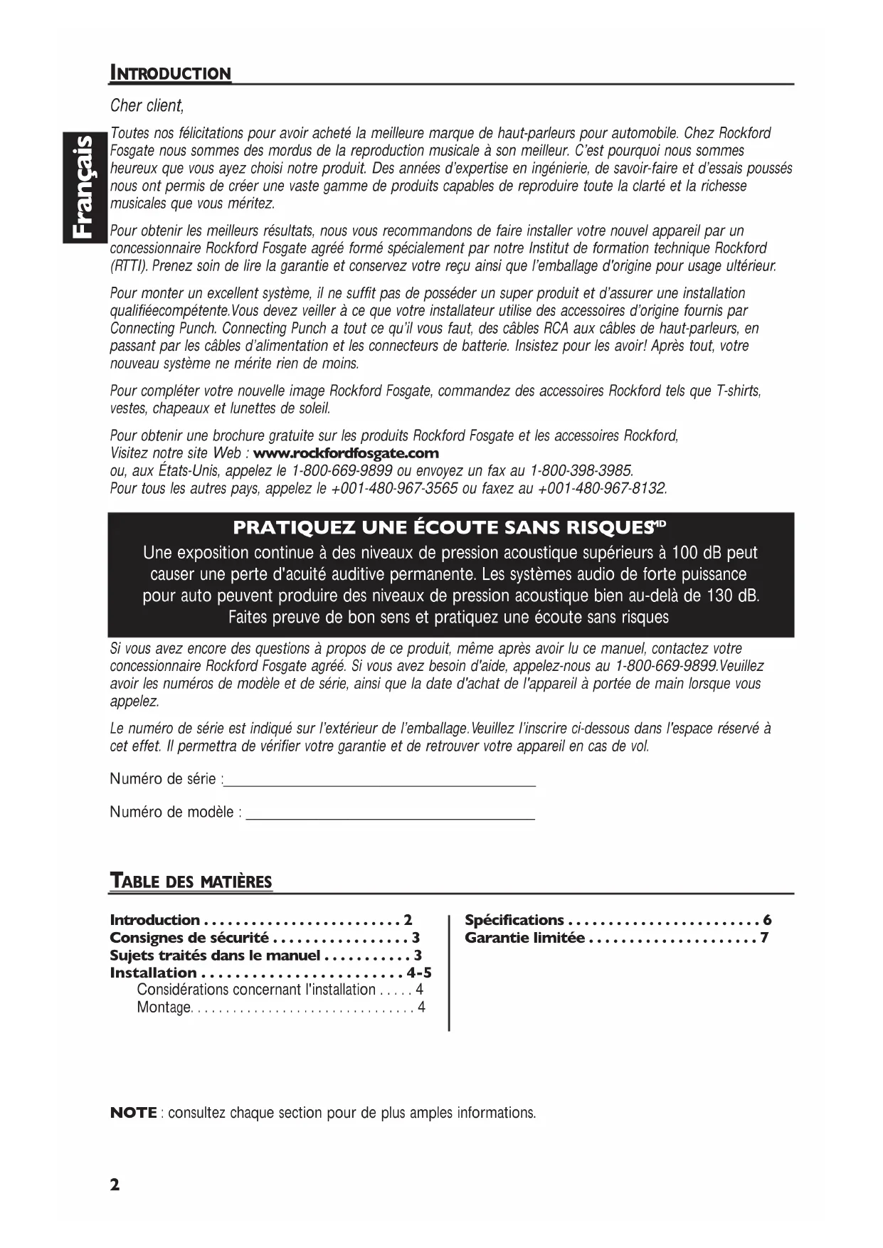 - Une exposition continue à des niveaux de pression acoustique supérieurs à 100 dB peut causer une perte d'acuité auditive permanente. Les systèmes audio de forte puissance pour auto peuvent produire des niveaux de pression acoustique bien au-delà de 130 dB. Faites preuve de bon sens et pratiquez une écoute sans risques NOTE : consultez chaque section pour de plus amples informations. Si vous avez encore des questions à propos de ce produit, même après avoir lu ce manuel, contactez votre concessionnaire Rockford Fosgate agréé. Si vous avez besoin d'aide, appelez-nous au 1-800-669-9899.Veuillez avoir les numéros de modèle et de série, ainsi que la date d'achat de l'appareil à portée de main lorsque vous appelez. Le numéro de série est indiqué sur l’extérieur de l’emballage.Veuillez l’inscrire ci-dessous dans l'espace réservé à cet effet. Il permettra de vérifier votre garantie et de retrouver votre appareil en cas de vol. Numéro de série :________________________________________ Numéro de modèle : _____________________________________ Introduction p. 2