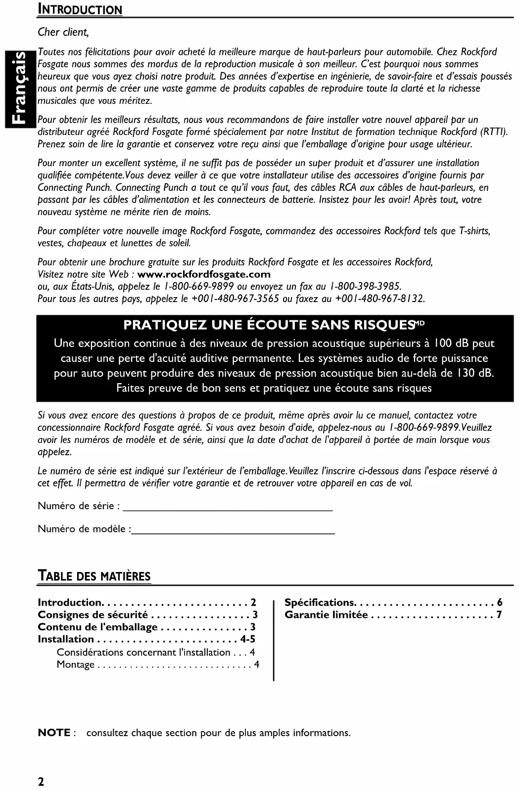 - Une exposition continue à des niveaux de pression acoustique supérieurs à 100 dB peut causer une perte d'acuité auditive permanente. Les systèmes audio de forte puissance pour auto peuvent produire des niveaux de pression acoustique bien au-delà de 130 dB. Faites preuve de bon sens et pratiquez une écoute sans risques NOTE : consultez chaque section pour de plus amples informations. Si vous avez encore des questions à propos de ce produit, même après avoir lu ce manuel, contactez votre concessionnaire Rockford Fosgate agréé. Si vous avez besoin d'aide, appelez-nous au 1-800-669-9899.Veuillez avoir les numéros de modèle et de série, ainsi que la date d'achat de l'appareil à portée de main lorsque vous appelez. Le numéro de série est indiqué sur l’extérieur de l’emballage.Veuillez l’inscrire ci-dessous dans l'espace réservé à cet effet. Il permettra de vérifier votre garantie et de retrouver votre appareil en cas de vol. Numéro de série : ___________________________________ Numéro de modèle :__________________________________ Introduction p. 2