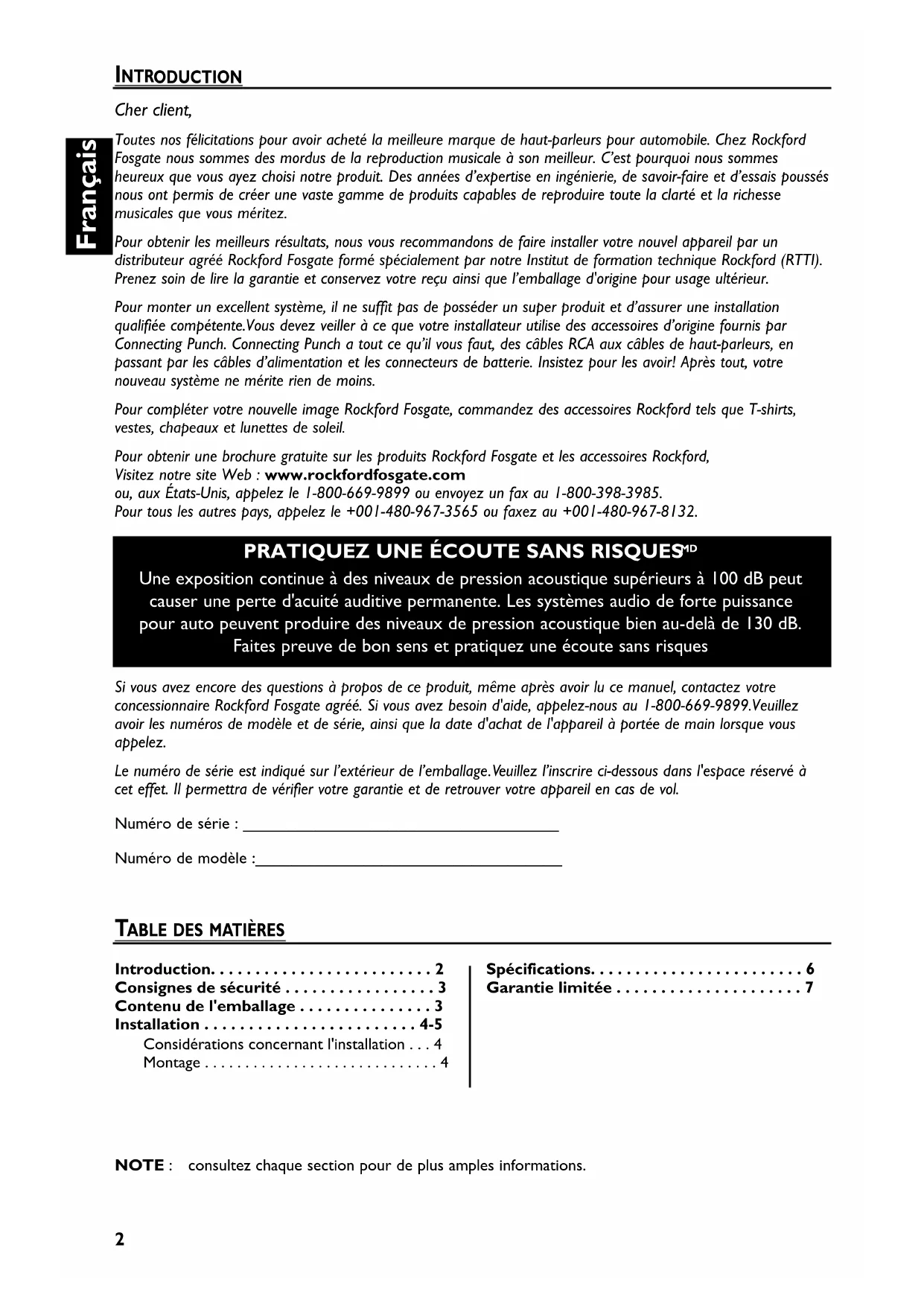 - Une exposition continue à des niveaux de pression acoustique supérieurs à 100 dB peut causer une perte d'acuité auditive permanente. Les systèmes audio de forte puissance pour auto peuvent produire des niveaux de pression acoustique bien au-delà de 130 dB. Faites preuve de bon sens et pratiquez une écoute sans risques NOTE : consultez chaque section pour de plus amples informations. Si vous avez encore des questions à propos de ce produit, même après avoir lu ce manuel, contactez votre concessionnaire Rockford Fosgate agréé. Si vous avez besoin d'aide, appelez-nous au 1-800-669-9899.Veuillez avoir les numéros de modèle et de série, ainsi que la date d'achat de l'appareil à portée de main lorsque vous appelez. Le numéro de série est indiqué sur l’extérieur de l’emballage.Veuillez l’inscrire ci-dessous dans l'espace réservé à cet effet. Il permettra de vérifier votre garantie et de retrouver votre appareil en cas de vol. Numéro de série : ___________________________________ Numéro de modèle :__________________________________ Introduction p. 2