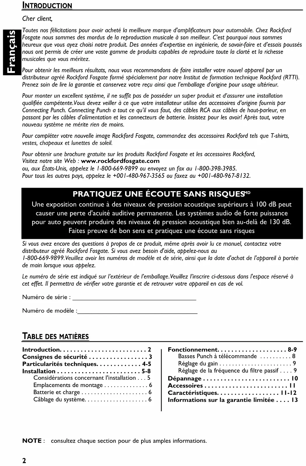 - Une exposition continue à des niveaux de pression acoustique supérieurs à 100 dB peut causer une perte d'acuité auditive permanente. Les systèmes audio de forte puissance pour auto peuvent produire des niveaux de pression acoustique bien au-delà de 130 dB. Faites preuve de bon sens et pratiquez une écoute sans risques NOTE : consultez chaque section pour de plus amples informations. Si vous avez encore des questions à propos de ce produit, même après avoir lu ce manuel, contactez votre distributeur agréé Rockford Fosgate. Si vous avez besoin d'aide, appelez-nous au 1-800-669-9899.Veuillez avoir les numéros de modèle et de série, ainsi que la date d'achat de l'appareil à portée de main lorsque vous appelez. Le numéro de série est indiqué sur l’extérieur de l’emballage.Veuillez l’inscrire ci-dessous dans l'espace réservé à cet effet. Il permettra de vérifier votre garantie et de retrouver votre appareil en cas de vol. Numéro de série : ___________________________________ Numéro de modèle :__________________________________ Introduction p. 2