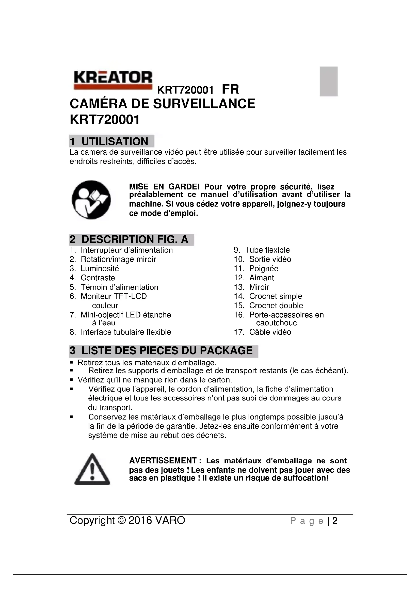 pas des jouets ! Les enfants ne doivent pas jouer avec des sacs en plastique ! Il existe un risque de suffocation!KRT720001 FR Copyright © 2016 VARO P a g e | 3 www.varo.com 1 x poignée avec écran LCD 1 x interface vidéo tubulaire flexible avec objectif 1 x câble vidéo 1 x crochet double 1 x crochet simple 1 x aimant 1 x miroir 1 x porte-accessoires en caoutchouc En cas de pièces manquantes ou endommagées, contactez votre revendeur. 4 PICTOGRAMMES Les symboles suivants sont utilisés dans ce mode d’emploi et/ou sur la machine:
