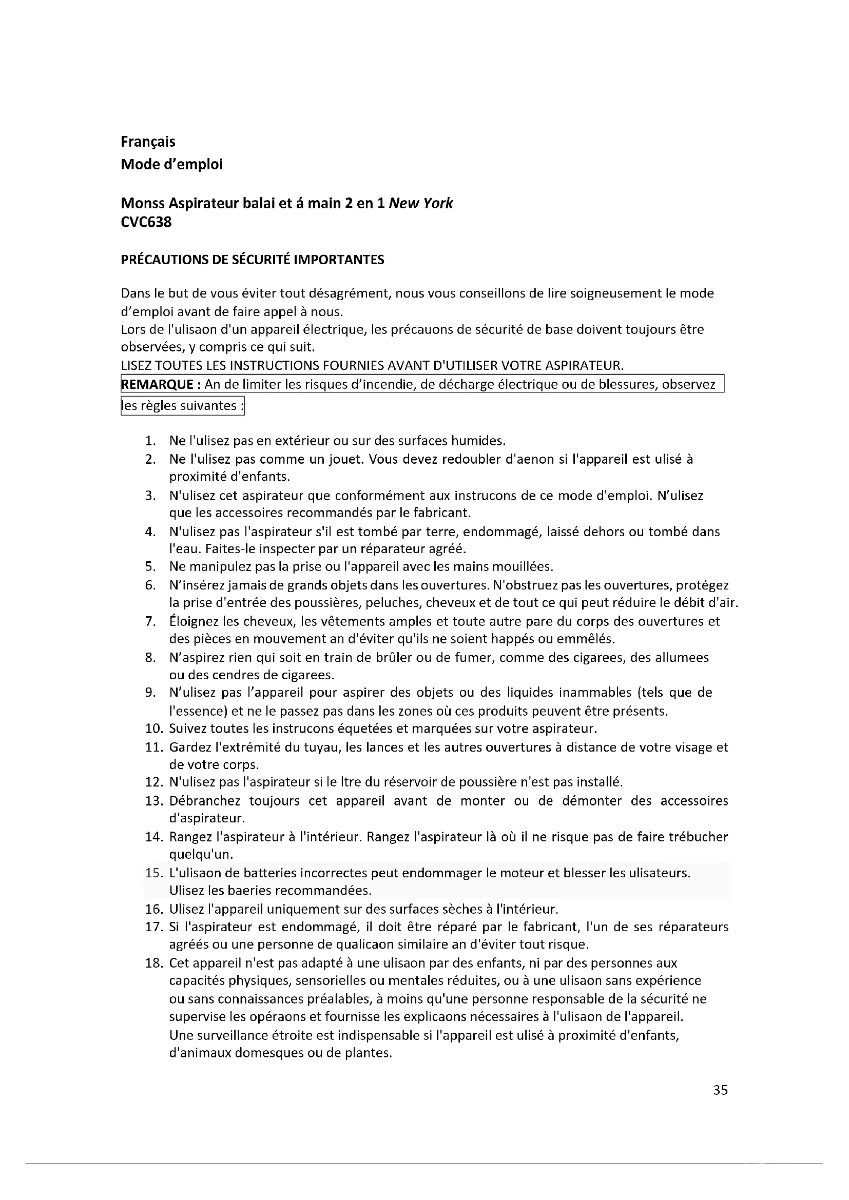 Dans le but de vous éviter tout désagrément, nous vous conseillons de lire soigneusement le mode d’emploi avant de faire appel à nous. Lors de l'utilisation d'un appareil électrique, les précautions de sécurité de base doivent toujours être observées, y compris ce qui suit. LISEZ TOUTES LES INSTRUCTIONS FOURNIES AVANT D'UTILISER VOTRE ASPIRATEUR. REMARQUE : Afin de limiter les risques d’incendie, de décharge électrique ou de blessures, observez les règles suivantes :