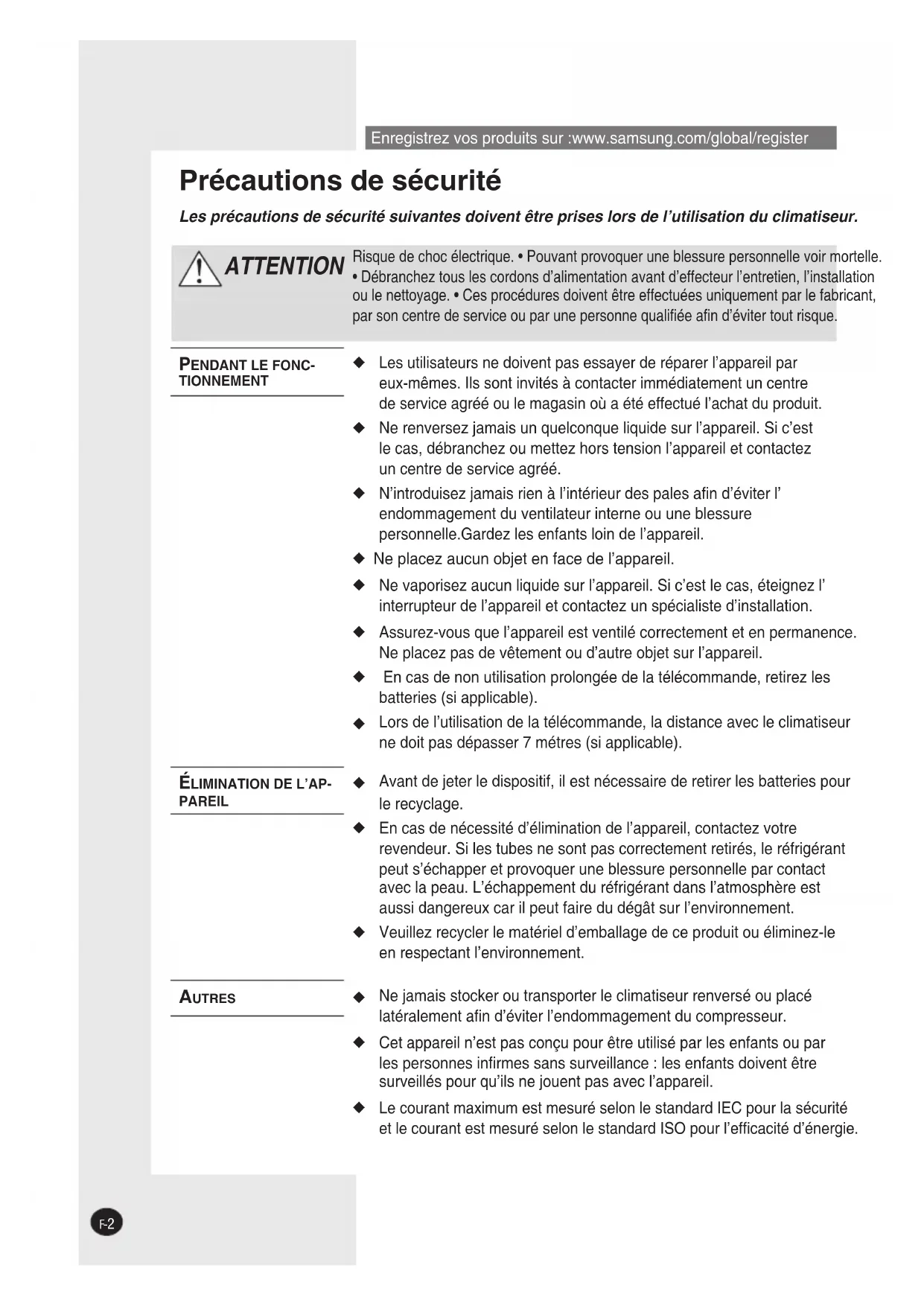 Le courant maximum est mesuré selon le standard IEC pour la sécurité et le courant est mesuré selon le standard ISO pour l’efficacité d’énergie. Enregistrez vos produits sur :www.samsung.com/global/register DB98-26506A(1)-F.indd 2 2007-2-26 16:48:01F
