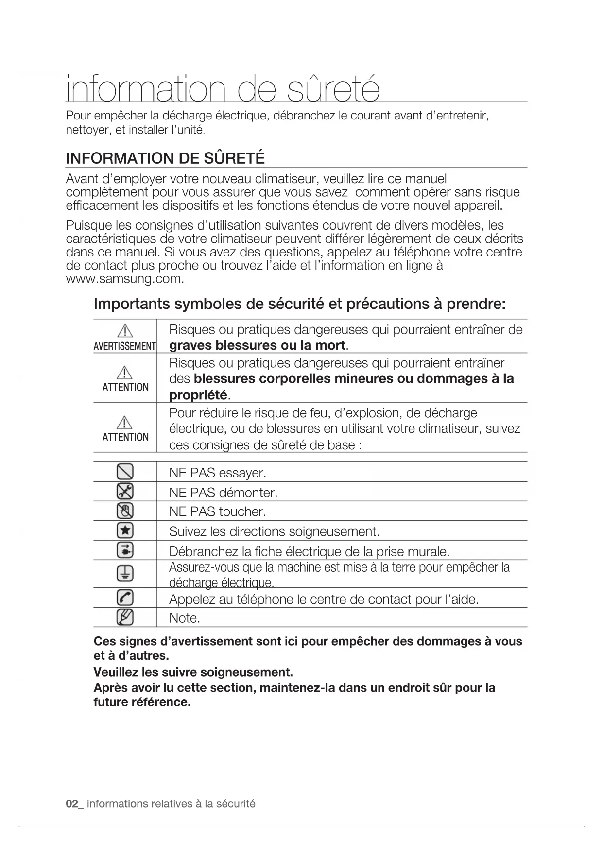 Avant d’employer votre nouveau climatiseur, veuillez lire ce manuel complètement pour vous assurer que vous savez comment opérer sans risque efficacement les dispositifs et les fonctions étendus de votre nouvel appareil. Puisque les consignes d’utilisation suivantes couvrent de divers modèles, les caractéristiques de votre climatiseur peuvent différer légèrement de ceux décrits dans ce manuel. Si vous avez des questions, appelez au téléphone votre centre de contact plus proche ou trouvez l’aide et l’information en ligne à www.samsung.com. Importants symboles de sécurité et précautions à prendre: AVERTISSEMENT Risques ou pratiques dangereuses qui pourraient entraîner de graves blessures ou la mort. ATTENTION Risques ou pratiques dangereuses qui pourraient entraîner des blessures corporelles mineures ou dommages à la propriété. ATTENTION Pour réduire le risque de feu, d’explosion, de décharge électrique, ou de blessures en utilisant votre climatiseur, suivez ces consignes de sûreté de base : NE PAS essayer. NE PAS démonter. NE PAS toucher. Suivez les directions soigneusement. Débranchez la fiche électrique de la prise murale. Assurez-vous que la machine est mise à la terre pour empêcher la décharge électrique. Appelez au téléphone le centre de contact pour l’aide. Note. Ces signes d’avertissement sont ici pour empêcher des dommages à vous et à d’autres. Veuillez les suivre soigneusement. Après avoir lu cette section, maintenez-la dans un endroit sûr pour la future référence.informations relatives à la sécurité _03 FRANÇAIS