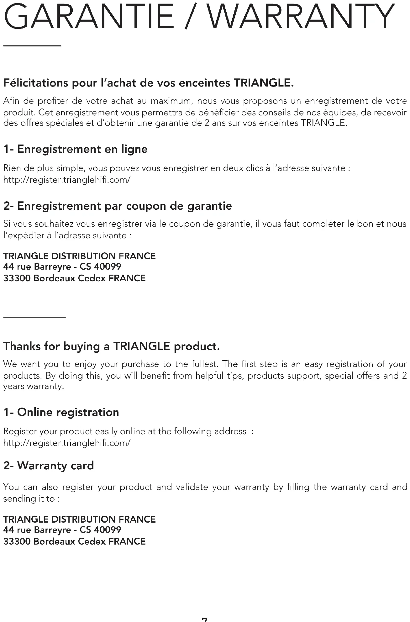44 rue Barreyre - CS 40099 33300 Bordeaux Cedex FRANCENote sur la garantie Vos enceintes TRIANGLE bénécient d’une garantie de 2 ans. Cette garantie prend effet à partir de la date d’achat et couvre tous les défauts de fabrication ou les dommages que pourraient subir vos enceintes, résultant de ces mêmes défauts. Cette garantie est accordée uniquement au premier utilisateur du produit et seulement après l’enregistrement en ligne ou la réception du coupon de garantie par la société TRIANGLE. Elle n’est pas transmissible en cas de revente dudit produit. De plus, elle cesserait de plein droit en cas de panne résultant d’un mauvais traitement ou d’une mauvaise manipulation. Sont exclus de la garantie : Î Bobine brûlée par excès de puissance Î Toute panne résultant d’une utilisation à des ns professionnelles (sonorisation, public address etc.) Î Toute panne résultant d’un stockage dans une pièce trop humide Î Membrane crevée ou arrachée Î Suspension déchirée Î Toute panne résultant d’un choc mécanique (chute, écrasement, etc.) Î Toute panne résultant de l’intervention d’une personne non habilitée par TRIANGLE Î Impacts sur l’ébénisterie (rayures, écrasement, chocs divers) Nom de l’acheteur / Buyer’s name / 购买者姓名: Adresse personnelle / Personal Address / 个人地址Î:: Email / 邮箱 Date d’achat / Date of purchase / 购买日期 : Nom du revendeur / Reseller’s name / 经销商名称: Modèle / Model / 产品 : N° Série / Serial Number / 序列号: 1er produit TRIANGLE / 1st TRIANGLE model / 首个TRIANGLE型号Î: Oui/Yes Non/No Précédent modèle TRIANGLE / Previous TRIANGLE model / 先前的TRIANGLE型号: J’ai choisi le matériel TRIANGLE pour la raison suivante / I chose TRIANGLE product for the following reason / 我选择 TRIANGLE产品的以下理由 : Conseil d’amis / Friend’s advice /Î朋友推荐 Conseil d’un revendeur / Dealer’s advice / 经销商推荐 Démonstration lors d’une exposition / Demonstration during an exhibition / 展会上推荐 Recommandation d’un journal ou site spécialisé / Recommandation from a magazine or website / 杂志或网站介绍 Lequel / which one / 哪一个 : Note on the warranty Your TRIANGLE loudspeakers are warranted for 2 years. This warranty takes effect from the date of purchase and covers any manufacturing defect or damage your loudspeakers could suffer as a result of these same defects. This warranty is granted solely to the rst owner of the product, and is not transmittable in the case of resale. To validate your warranty, you will need to register online or mail the warranty coupon to TRIANGLE. Please note, this warranty is voided if any fault arises from ill- treatment or careless handling of the product. The following are not guaranteed : Î A burned voice-coil caused by overloading the driver Î Any fault occurring from professional usage (public sound systems, PA systems, etc.) Î Any fault resulting from storage in areas of high humidity Î A pierced or torn membrane Î A torn suspension Î Any fault resulting from a mechanical shock (ex if dropped or handled roughly) Î Any fault arising from servicing by anyone other than an authorized TRIANGLE service technician Î Damaged cabinets due to mishandling GARANTIE / WARRANTY / 保证卡谢谢您购买法国Triangle的产品。Î 我们希望您能购物愉快。第一步请轻松注册您的产品,这样做,您将受益于有用的提示,产品支持,特 别优惠和2年保修服务。 1.在线注册 在以下地址轻松注册您的产品:Î HTTP://Reavest.TangangLeHIIF.COM/Î 2.保修卡 您也可以注册您的产品和通过填写保修卡验证您的保修,并将其发送到: