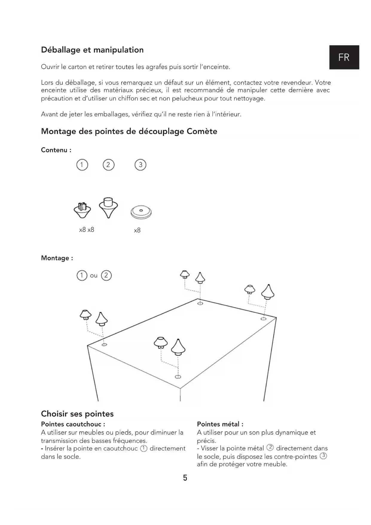 Déballage et manipulation Ouvrir le carton et retirer toutes les agrafes puis sortir l’enceinte. Lors du déballage, si vous remarquez un défaut sur un élément, contactez votre revendeur. Votre enceinte utilise des matériaux précieux, il est recommandé de manipuler cette dernière avec précaution et d’utiliser un chiffon sec et non pelucheux pour tout nettoyage. Avant de jeter les emballages, vériez qu’il ne reste rien à l’intérieur. Montage des pointes de découplage Comète Contenu : Montage :