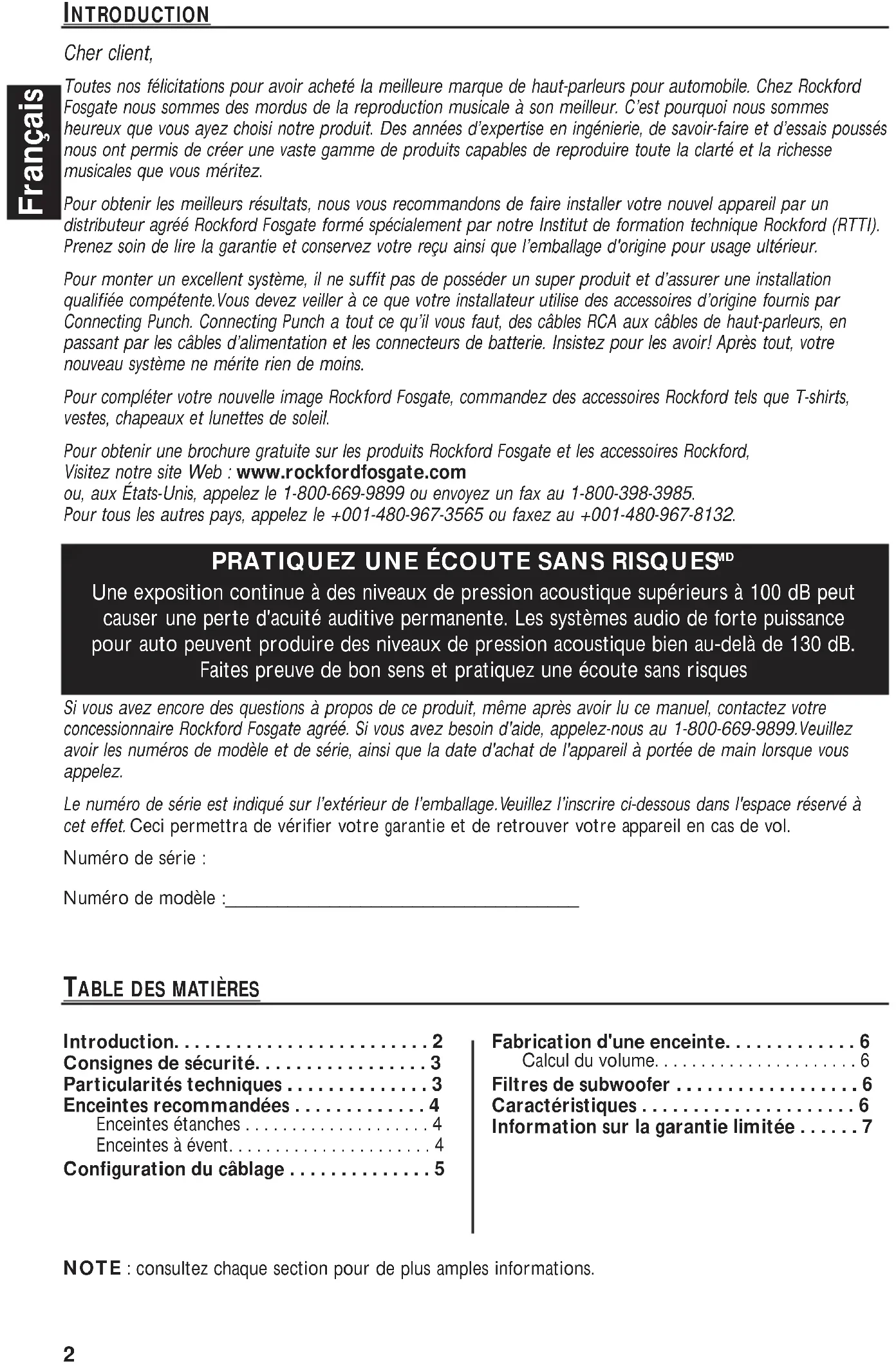 - Une exposition continue à des niveaux de pression acoustique supérieurs à 100 dB peut causer une perte d'acuité auditive permanente. Les systèmes audio de forte puissance pour auto peuvent produire des niveaux de pression acoustique bien au-delà de 130 dB. Faites preuve de bon sens et pratiquez une écoute sans risques NOTE : consultez chaque section pour de plus amples informations. Si vous avez encore des questions à propos de ce produit, même après avoir lu ce manuel, contactez votre concessionnaire Rockford Fosgate agréé. Si vous avez besoin d'aide, appelez-nous au 1-800-669-9899.Veuillez avoir les numéros de modèle et de série, ainsi que la date d'achat de l'appareil à portée de main lorsque vous appelez. Le numéro de série est indiqué sur l’extérieur de l’emballage.Veuillez l’inscrire ci-dessous dans l'espace réservé à cet effet. Ceci permettra de vérifier votre garantie et de retrouver votre appareil en cas de vol. Numéro de série : Numéro de modèle :__________________________________ Introduction p. 2