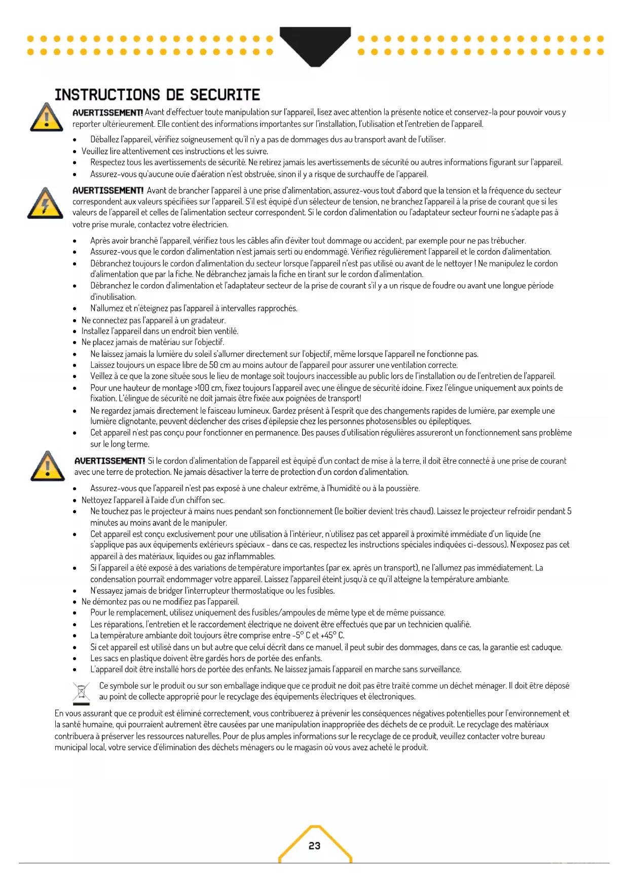 - L'appareil doit être installé hors de portée des enfants. Ne laissez jamais l'appareil en marche sans surveillance. Ce symbole sur le produit ou sur son emballage indique que ce produit ne doit pas être traité comme un déchet ménager. Il doit être déposé au point de collecte approprié pour le recyclage des équipements électriques et électroniques. En vous assurant que ce produit est éliminé correctement, vous contribuerez à prévenir les conséquences négatives potentielles pour l'environnement et la santé humaine, qui pourraient autrement être causées par une manipulation inappropriée des déchets de ce produit. Le recyclage des matériaux contribuera à préserver les ressources naturelles. Pour de plus amples informations sur le recyclage de ce produit, veuillez contacter votre bureau municipal local, votre service d'élimination des déchets ménagers ou le magasin où vous avez acheté le produit.Dès réception du produit, déballez soigneusement le carton, vérifiez son contenu pour vous assurer que toutes les pièces sont présentes et qu'elles ont été reçues en bon état. Avisez immédiatement l'expéditeur et conservez le matériel d'emballage ; contrôlez si des pièces semblent endommagées lors de l'expédition ou si le colis lui-même montre des signes de mauvaise manipulation. Conservez l'emballage et tout le matériel d'emballage. Dans le cas où le produit doit être retourné à l'usine, il est important que le produit soit retourné dans son emballage d'origine. Si l'appareil a été exposé à des variations de température importantes (par ex. après un transport), ne l’allumez pas immédiatement. La condensation pourrait endommager votre appareil. Laissez l'appareil éteint jusqu'à ce qu'il atteigne la température ambiante. Le type d'alimentation auquel le produit doit être connecté est indiqué sur l'étiquette à l'arrière du produit. Vérifiez que la tension secteur corresponde à cette tension, toutes les autres tensions que celles spécifiées peuvent endommager l’appareil. Le produit doit également être branché directement sur le secteur et peut être utilisé. Pas de gradateur ni d'alimentation réglable. L'appareil est équipé d'un connecteur de sortie d'alimentation. En fonction des conditions locales, plusieurs appareils peuvent être reliés entre eux par l'entrée et la sortie du bloc d'alimentation. Connectez un maximum de quatre unités (si vous utilisez une tension de 230V/16A) à la suite. Utilisez un câble trois conducteurs homologué avec une section de 1,5 mm² au moins. Respectez les instructions de montage du fabricant et le code couleur du câble. N'éteignez pas l'appareil en retirant le cordon d'alimentation, mais utilisez l'interrupteur marche/arrêt ou schuko ! Reliez toujours l'appareil à un circuit protégé (disjoncteur ou fusible). Assurez-vous que l'appareil dispose d'une mise à la terre électrique appropriée pour éviter tout risque d'électrocution ou d'incendie. L’appareil peut être installé sur une surface stable et plane. Grâce aux possibilités de fixation de la plaque de base, l'appareil peut également être monté à l'envers sur une poutrelle, voir photo ci-dessous. Pour la fixation, il est nécessaire d'utiliser des colliers de serrage certifiés avec une capacité de charge correspondante. L'emplacement de montage doit être suffisamment stable et pouvoir supporter un poids égal à 10 fois le poids de l'appareil. Fixez l'appareil à l'aide d'une élingue de sécurité afin qu'il ne puisse pas tomber. Lors de toute installation, respectez toujours les directives européennes et nationales concernant l’accrochage des produits, les structures et toutes les autres questions de sécurité. Faites toujours vérifier l'installation par un revendeur agréé ! Si vous utilisez un contrôleur DMX standard, vous pouvez connecter la sortie DMX du contrôleur directement à l'entrée DMX du premier appareil dans une chaîne DMX. Connectez toujours la sortie d'un appareil à l'entrée de l'appareil suivant jusqu'à ce que tous les appareils soient connectés entre eux.