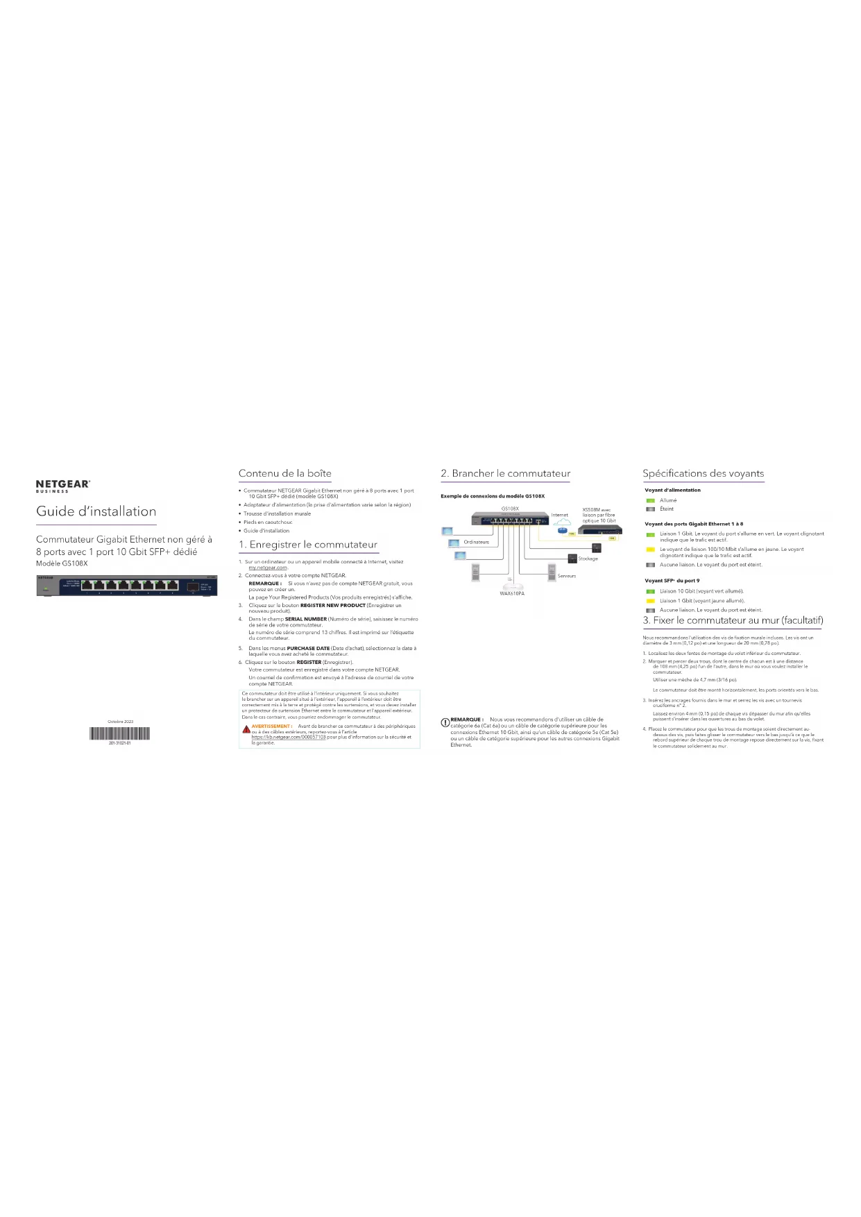 Nous recommandons l’utilisation des vis de xation murale incluses. Les vis ont un diamètre de 3mm (0,12po) et une longueur de 20mm (0,78po).1. Localisez les deux fentes de montage du volet inférieur du commutateur.2. Marquer et percer deux trous, dont le centre de chacun est à une distance de 108mm (4,25po) l’un de l’autre, dans le mur où vous voulez installer le commutateur. Utiliser une mèche de 4,7mm (3/16po).Le commutateur doit être monté horizontalement, les ports orientés vers le bas.3. Insérez les ancrages fournis dans le mur et serrez les vis avec un tournevis cruciforme n°2.Laissez environ 4mm (0,15po) de chaque vis dépasser du mur an qu’elles puissent s’insérer dans les ouvertures au bas du volet.4. Placez le commutateur pour que les trous de montage soient directement au-dessus des vis, puis faites glisser le commutateur vers le bas jusqu’à ce que le rebord supérieur de chaque trou de montage repose directement sur la vis, xant le commutateur solidement au mur.NETGEAR, Inc. 350 East Plumeria Drive San Jose, CA 95134, États-Unis Soutien et communauté Visitez https://www.netgear.fr/support pour obtenir des réponses à vos questions et accéder aux plus récents téléchargements. Vous pouvez également vous référer à notre communauté NETGEAR pour proter de conseils utiles à community.netgear.com. Information réglementaire et juridique Pour obtenir des renseignements sur la conformité, y compris la déclaration de conformité de l’UE, visitez le netgear.com/ca-fr/about/regulatory/. Consultez le document relatif à la conformité réglementaire avant de brancher le bloc d’alimentation. N’utilisez pas cet appareil à l’extérieur. Si vous branchez des câbles ou des appareils qui se trouvent à l’extérieur par rapport à ce commutateur, reportez-vous à l’article https://kb.netgear.com/000057103 pour plus d’information sur la sécurité et la garantie. Ne s’applique qu’aux appareils à 6GHz: utilisez l’appareil à l’intérieur seulement. L’utilisation d’appareils à 6GHz est interdite sur les plateformes pétrolières, les voitures, les trains, les bateaux et les avions. L’utilisation de cet appareil est toutefois autorisée dans les gros avions alors qu’ils volent à plus de 3000mètres (10000pieds). Il est interdit d’utiliser des émetteurs dans la bande 5,925 à 7,125GHz pour le contrôle ou les communications avec des systèmes d’avion sans pilote. Caractéristiques techniques Caractéristique Description Interfaces du réseau Ethernet Ports1 à 8: Gigabit Ethernet avec connecteursRJ-45 prenant en charge les normes100BASE-TX et 1000BASE-T Port de liaison ascendante Port9: SFP+ 1Gbit/10Gbit Sans ventilateur 0dBA Adaptateur secteur Alimentation CC de 12V à 1,5A Consommation d’énergie: 4,63W Dimensions (L x P x H) 236 x 102 x 27mm (9,3 x 4 x 1po) Poids 575g (1,27lb) Température de fonctionnement 0 à 40°C (32 à 104°F) Humidité de fonctionnement 10 à 90% d’humidité relative, sans condensation Altitude de fonctionnement maximale 3000m (10000pi) Température de stockage -20 à 70°C (-4 à 158°F) Humidité d’entreposage 5 à 95% d’humidité relative, sans condensation Altitude d’entreposage maximale 3000m (10000pi) Certications et conformité électromagnétiques Appareil FCC de classe B, EU-RoHS Certications de sûreté CB, CE classe B, VCCI classe B, C-Tick/RCM classe B © NETGEAR, Inc., NETGEAR et le logo NETGEAR sont des marques de commerce de NETGEAR, Inc. Toutes les autres marques de commerce sont utilisées à titre de référence uniquement. Modules pris en charge Modèle Description Émetteurs-récepteurs SFP à bre optique de 1Gbit AGM731F Émetteur-récepteur NETGEAR1000BASE-SX SFP LC (multimode, 1000m OM4, 550m OM3 50/125µm, 275m OM2/OM1 62,5/125µm) AGM732F Émetteur-récepteur NETGEAR1000BASE-LX SFP LC (monomode, 10km 9/125µm) Émetteurs-récepteurs SFP en cuivre1Gbit ATTENTION: Le port SFP+ du GS108X prend en charge le 10Gbit sur les modules à bre optique seulement. Il ne prend pas en charge les modules en cuivre de 10Gbit. En revanche, les modules en cuivre de 1Gibt sont pris en charge. AGM734 Émetteur-récepteur NETGEAR1000BASE-T SFPRJ45 Câble à branchement SFP+10Gbit AXC761 Câble à branchement passif NETGEAR SFP+ à SFP+10Gbit de 1m AXC763 Câble à branchement passif NETGEAR SFP+ à SFP+10Gbit de 3m Émetteur-récepteur SFP+ à bre optique10Gbit AXM761 Émetteur-récepteur NETGEAR10GBASE-SR SFP+ LC (multimode, 550m OM4, 300m OM3 50/125µm, 33m OM2/OM1 62,5/125µm) AXM762 Émetteur-récepteur NETGEAR10GBASE-LR SFP+ LC (monomode, 10km 9/125µm) AXM764 Émetteur-récepteur NETGEAR10GBASE-LR LITE SFP+ LC (monomode, 2km 9/125µm)