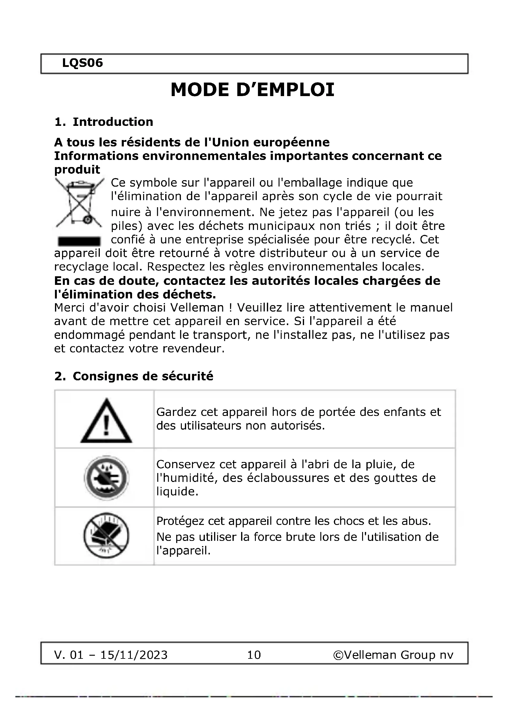 Le copyright de ce manuel est la propriété de Velleman Group nv. Tous les droits mondiaux sont réservés. Aucune partie de ce manuel ne peut être copiée, reproduite, traduite ou réduite sur un support électronique ou autre sans l'accord écrit préalable du détenteur des droits d'auteur.LQS06