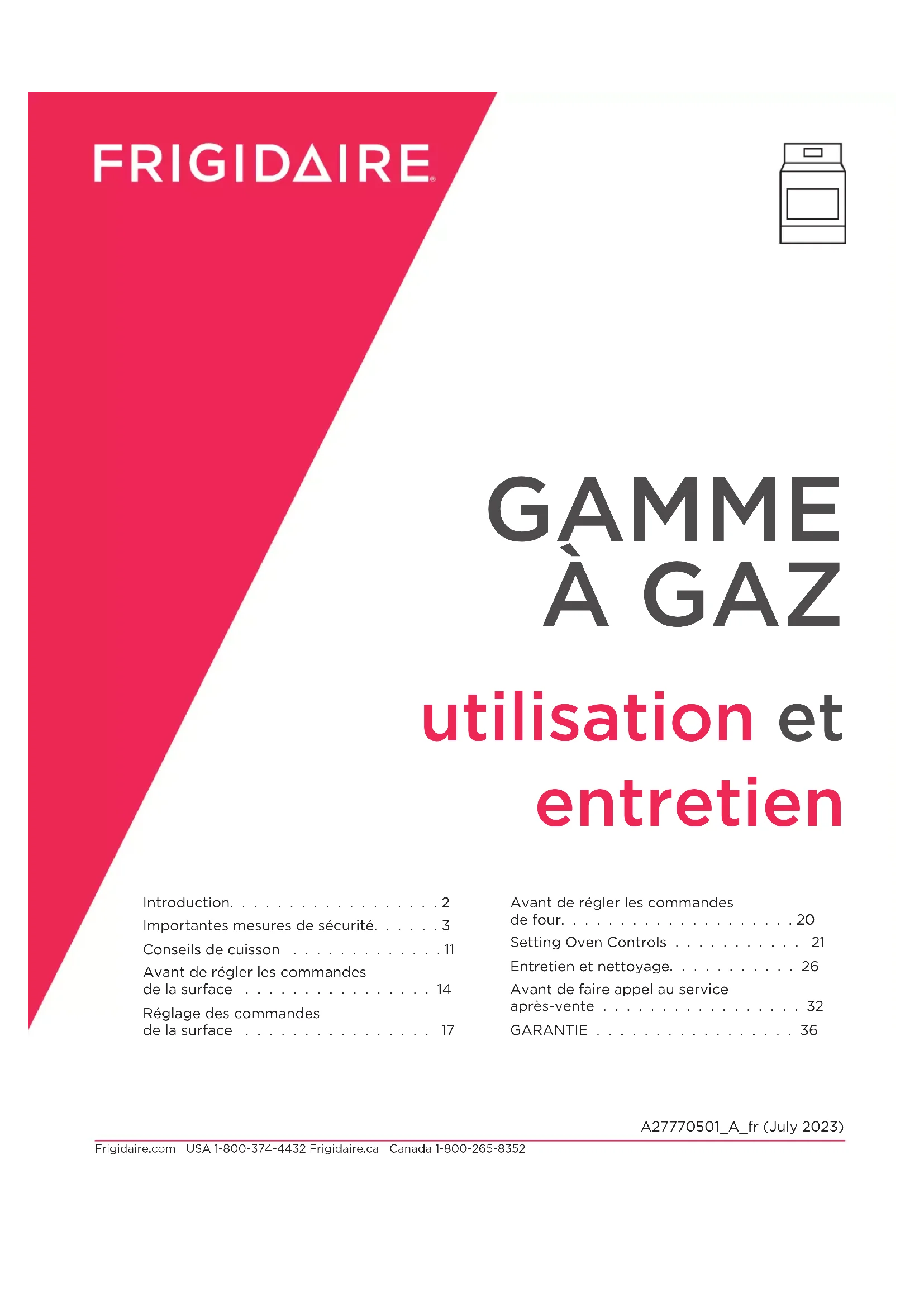 - GARANTIE utilisation et entretien GAMME À GAZ2 INTRODUCTION INTRODUCTION Bienvenue dans notre famille Merci d’avoir amené Frigidaire chez vous! Nous considérons que votre achat marque le début d’une longue relation avec nous autres.Ce manuel est votre ressource pour l’utilisation et l’entretien de votre produit. Veuillez le lire avant d’utiliser votre appareil. Gardez-le à portée de main pour une référence rapide. Si quelque chose ne vous semble pas correct, la section Dépannage vous aidera à résoudre les problèmes courants.Des FAQ, des conseils utiles et des vidéos, des produits de nettoyage ainsi que des accessoires de cuisine et domestiques sont disponibles sur www.frigidaire.com.Nous sommes là pour vous! Visitez notre site Web, discutez avec un agent ou appelez-nous si vous avez besoin d’aide. Nous pourrons peut-être vous aider à éviter une visite de service. Si vous avez besoin de service, nous pouvons vous aider.Faisons-le o ciel! Assurez-vous d’enregistrer votre produit.Conservez les informations de votre produit ici pour qu’il soit facile à trouver.Numéro de modèle: Numéro de série: Date d’achat: Emplacement du numéro de série Lisez toutes les consignes de sécurité au début de votre manuel d’utilisation et d’entretien. Retirez tous les matériaux d’emballage de votre appareil avant de faire cuire des aliments. Vérifi ez que l’alimentation électrique de l’appareil est allumée. Vérifi ez que le régulateur de pression de gaz est activé. Vérifi ez les instructions d’installation si vous avez besoin d’aide. Essuyez l’intérieur de la cavité du four avec un chi on humide. Appliquez une fi ne couche d’huile de cuisson sur les côtés des grilles du four pour qu’elles glissent en douceur. Réglez l’horloge. Voir (page 22) pour les instructions. Testez tous les éléments de surface/brûleurs pour vous assurer qu’ils fonctionnent correctement (page 17). Avant de faire cuire des aliments, allumez le four à 177°C (350°F) pendant 30minutes (page ref). Certains bruits et odeurs seront générés lors du premier cycle de cuisson; cela est normal. N’oubliez pas d’e ectuer l’enregistrement de votre produit! Liste de contrôle d’installation p. 36
