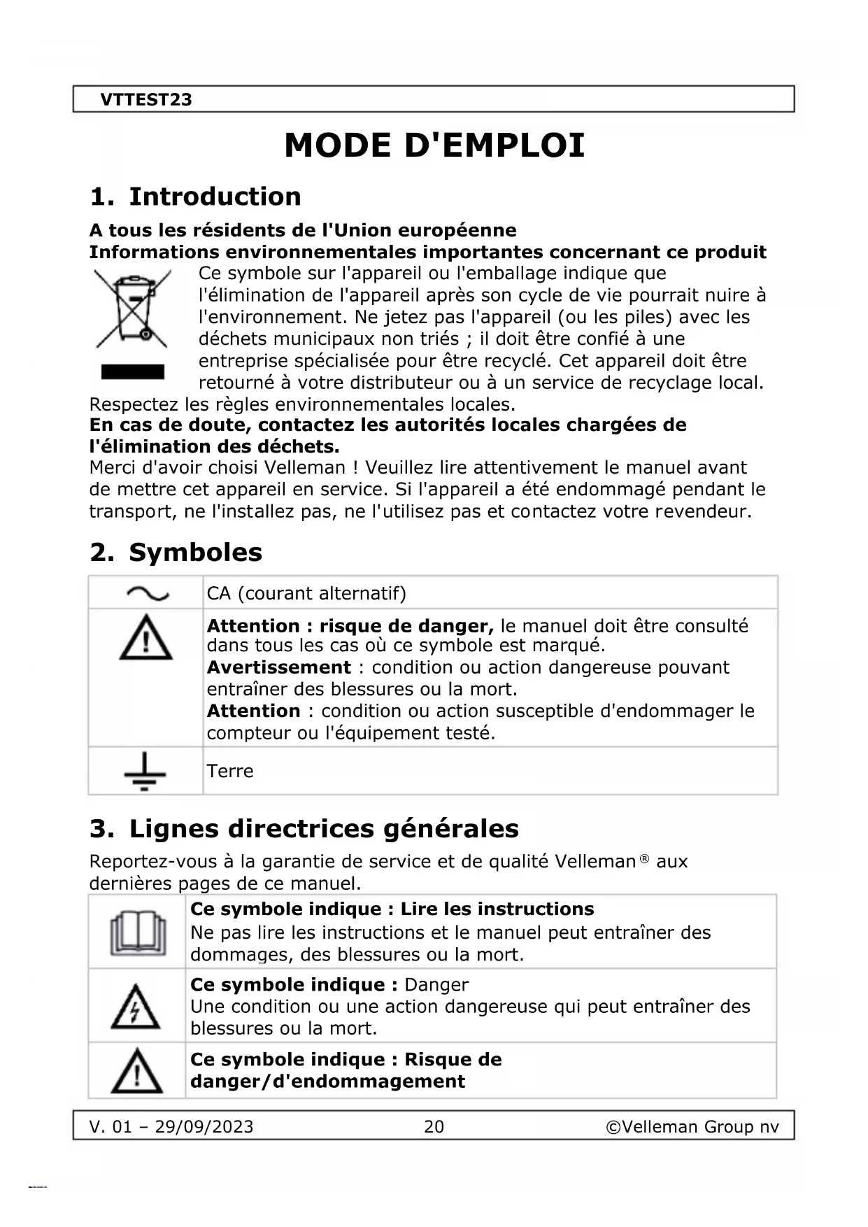 Retrouvez gratuitement la notice de l'appareil VTTEST23 VELLEMAN au format PDF.