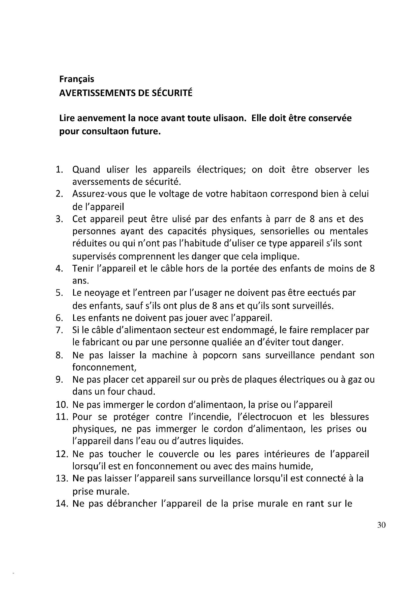 Avertissements : Certains grains de pop-corn peuvent ne pas gonfler ou ne pas être soufflés correctement pendant la cuisson. Faire preuve de prudence et éviter tout contact direct avec les grains brûlants.