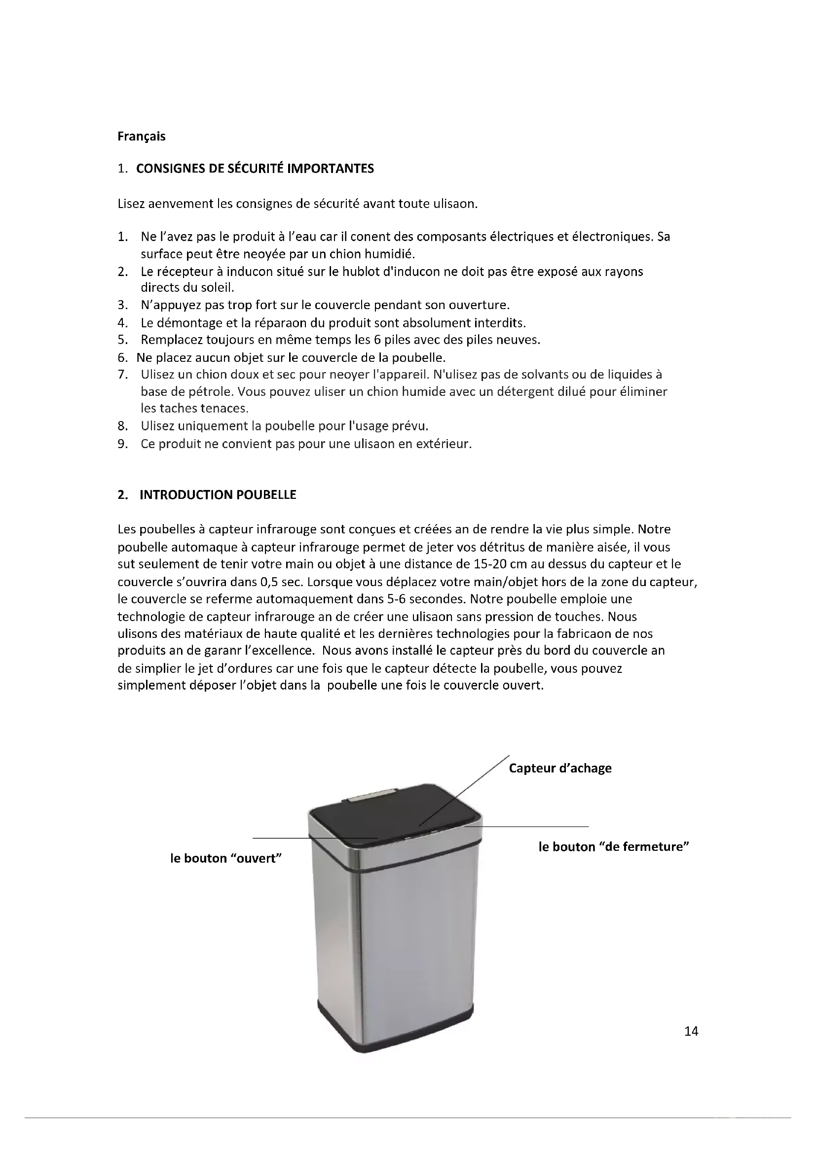 Etape 1 Sortir la poubelle ATTENTION: déballez toutes les pièces et enlevez le matériau de protection. Ne laissez pas les sacs en plastique à la portée des enfants. Le système de contrôle d’ouverture et de fermeture automatique consiste en microprocesseurs, dispositifs de détection infrarouges, dispositifs de transmission mécaniques et un système électrique. Il s’agit d’un produit de haute technologie, combinant une machine, la légèreté et la technologie électrique. Le produit est composé du couvercle (contenant tous les mécaniques et le microprocesseur) et d’une corbeille. Ses avantages principaux sont ses hautes performances, sa longue durée de service et sa faible consommation d’énergie. Etape 2 Insertion des piles Retirez le couvercle supérieur depuis l’intérieur de la corbeille. Ouvrez le couvercle du compartiment à piles situé sur la partie inférieure du couvercle puis insérez six piles “AA”. Installez-les selon la “polarité” indiquée. Etape 3 Insertion d’un sac-poubelle Insérez le sac-poubelle à travers le cadre d’accrochage. Enroulez le sac autour du cadre et des bords de la corbeille. Assurez-vous que les 6 piles sont remplacées en même temps lors de l'installation de nouvelles piles. Etape 4 Assemblage de la poubelle Maintenez la partie avant du couvercle supérieur puis appuyez sur la partie supérieure de la corbeille. Placez la partie arrière du couvercle supérieur sur la corbeille en premier, puis appuyez sur la partie avant. Mettez l’unité en marche via le commutateur d’alimentation situé à l’intérieur de la poubelle. Etape 5 Capteur de mouvements infrarouge Lorsque vous déposez un objet dans la poubelle, tenez l’objet ou votre main sans mouvement à environ 15-20 cm au-dessus du capteur. Le couvercle s’ouvre automatiquement dans la demi- seconde, celui-ci se refermera dans les 5-6 secondes de la levée de votre main. Lorsque l’objet ou votre main ne quitte pas la zone du capteur, le couvercle reste ouvert. La touche permet de maintenir ouvert le couvercle jusqu’à ce que vous appuyiez sur la touche de fermeture. Le bouton de fermeture permet de refermer le couvercle et de le réinitialiser pour la fermeture et ouverture automatique. **laisser le couvercle ouvert pendant une période prolongée consomme l’énergie des piles.