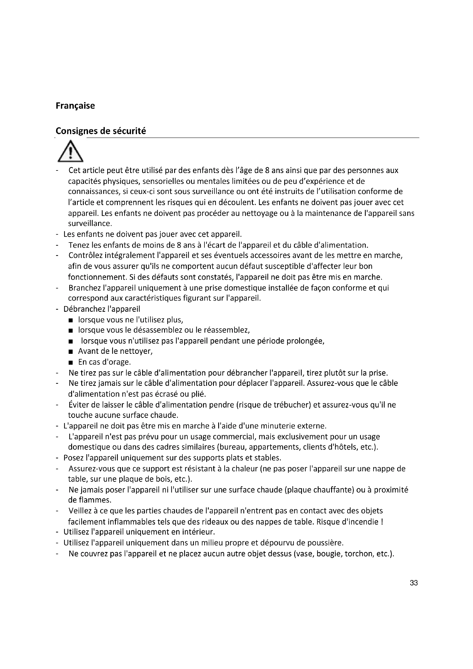Service If you have any further questions about the product after reading this manual, please contact the Trebs customer service. Trebs BV Thermiekstraat 1a 6361 HB Nuth Nederland Internet: www.trebs.nl33 Française Consignes de sécurité - Cet article peut être utilisé par des enfants dès l’âge de 8 ans ainsi que par des personnes aux capacités physiques, sensorielles ou mentales limitées ou de peu d’expérience et de connaissances, si ceux-ci sont sous surveillance ou ont été instruits de l’utilisation conforme de l’article et comprennent les risques qui en découlent. Les enfants ne doivent pas jouer avec cet appareil. Les enfants ne doivent pas procéder au nettoyage ou à la maintenance de l'appareil sans surveillance. - Les enfants ne doivent pas jouer avec cet appareil. - Tenez les enfants de moins de 8 ans à l'écart de l'appareil et du câble d'alimentation. - Contrôlez intégralement l'appareil et ses éventuels accessoires avant de les mettre en marche, afin de vous assurer qu'ils ne comportent aucun défaut susceptible d'affecter leur bon fonctionnement. Si des défauts sont constatés, l'appareil ne doit pas être mis en marche. - Branchez l'appareil uniquement à une prise domestique installée de façon conforme et qui correspond aux caractéristiques figurant sur l'appareil. - Débranchez l'appareil ■ lorsque vous ne l'utilisez plus, ■ lorsque vous le désassemblez ou le réassemblez, ■ lorsque vous n'utilisez pas l'appareil pendant une période prolongée, ■ Avant de le nettoyer, ■ En cas d'orage. - Ne tirez pas sur le câble d'alimentation pour débrancher l'appareil, tirez plutôt sur la prise. - Ne tirez jamais sur le câble d'alimentation pour déplacer l'appareil. Assurez-vous que le câble d'alimentation n'est pas écrasé ou plié. - Éviter de laisser le câble d'alimentation pendre (risque de trébucher) et assurez-vous qu'il ne touche aucune surface chaude. - L'appareil ne doit pas être mis en marche à l'aide d'une minuterie externe. - L'appareil n'est pas prévu pour un usage commercial, mais exclusivement pour un usage domestique ou dans des cadres similaires (bureau, appartements, clients d'hôtels, etc.). - Posez l'appareil uniquement sur des supports plats et stables. - Assurez-vous que ce support est résistant à la chaleur (ne pas poser l'appareil sur une nappe de table, sur une plaque de bois, etc.). - Ne jamais poser l'appareil ni l'utiliser sur une surface chaude (plaque chauffante) ou à proximité de flammes. - Veillez à ce que les parties chaudes de l'appareil n'entrent pas en contact avec des objets facilement inflammables tels que des rideaux ou des nappes de table. Risque d'incendie ! - Utilisez l'appareil uniquement en intérieur. - Utilisez l'appareil uniquement dans un milieu propre et dépourvu de poussière. - Ne couvrez pas l'appareil et ne placez aucun autre objet dessus (vase, bougie, torchon, etc.).34 - Assurez-vous que l'appareil fonctionne dans un milieu dégagé. Pour éviter l'accumulation de chaleur, l'appareil ne doit pas être placé directement sous un placard. - N'utilisez pas l'appareil à proximité d'objets inflammables ou de bombe aérosol. - Ne laissez pas l'appareil sans surveillance lorsqu'il est en marche. - N'utilisez aucun accessoire qui n'appartienne pas à l'appareil. - L'appareil, le câble d'alimentation et la prise ne doivent jamais être immergés dans l'eau ou dans d'autres liquides – RISQUE D'ÉLECTROCUTION ! - La garantie est annulée en cas de non-respect des points suivants : ■ N'utilisez l'appareil qu'aux fins décrites dans le présent mode d'emploi. Toute autre utilisation pourrait endommager l'appareil. ■ Toute modification de l'appareil est interdite pour des raisons de sécurité. ■ N'ouvrez pas le corps de l'appareil ; aucun élément de contrôle ne se trouve à l'intérieur. ■ N'utilisez pas l'appareil si le câble d'alimentation est endommagé. Emmenez-le plutôt dans un atelier agréé pour le faire réparer. ■ Les réparations d'appareils électriques doivent être effectuées par des professionnels pour éviter les risques et parce qu'il y a des consignes de sécurité. ■ Le présent mode d'emploi a pour but de familiariser l'utilisateur avec les consignes de sécurité et les fonctions de l'appareil. Par conséquent, conservez toujours bien ce mode d'emploi pour pouvoir le consulter à tout moment. ATTENTION –RISQUE DE BRÛLURE : - Certaines parties de l'appareil chauffent pendant qu'il est en marche. Évitez de mettre vos mains en contact avec ces surfaces chaudes.35