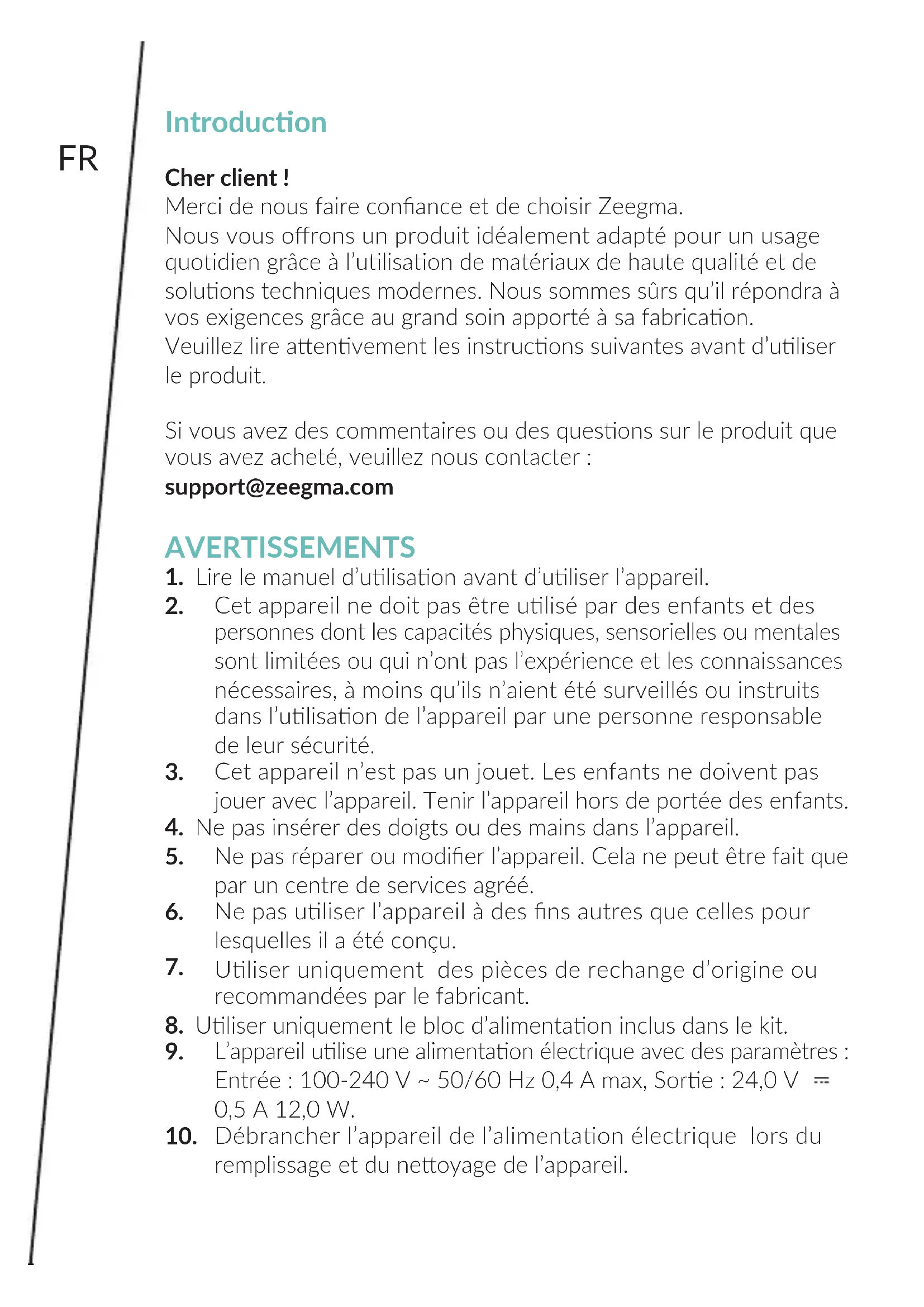 - Svuotare il serbatoio per l’acqua. Assicurarsi che tue le par siano completamente asciue. Conservare il disposivo in un luogo asciuo. Le immagini hanno caraere illustravo, l’aspeo reale dei prodo può dierire da quello presentato nelle immagini.FR Introducon Cher client ! Merci de nous faire conance et de choisir Zeegma. Nous vous orons un produit idéalement adapté pour un usage quodien grâce à l’ulisaon de matériaux de haute qualité et de soluons techniques modernes. Nous sommes sûrs qu’il répondra à vos exigences grâce au grand soin apporté à sa fabricaon. Veuillez lire aenvement les instrucons suivantes avant d’uliser le produit. Si vous avez des commentaires ou des quesons sur le produit que vous avez acheté, veuillez nous contacter : support@zeegma.com AVERTISSEMENTS